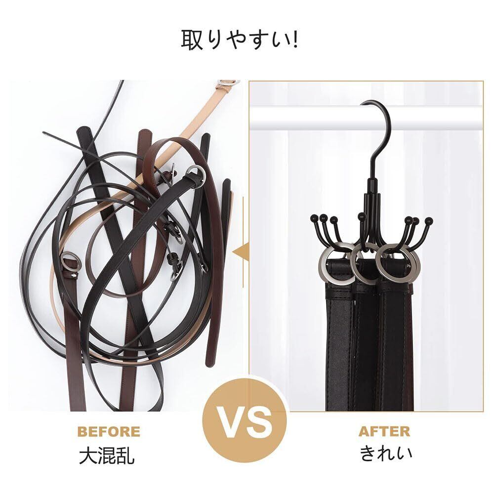 ベルトハンガー2本組 ベルト収納 掛け フック 360°回転収納ラック クローゼット 収納 ネクタイハンガー ネクタイ掛け ペットストラップ 帽子 ブラジャー ハンドバッグ マフラー 小物対応 空間節約 収納便利(ブラック+シルバー)