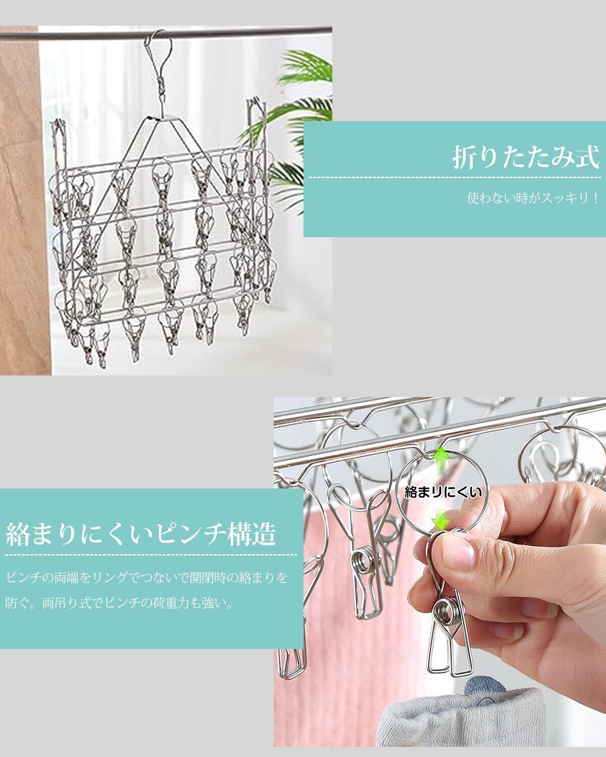 AYO ピンチハンガー 洗濯 物干し 52ピンチ 角ハンガー 引っ張るだけ オールステンレス 室内外両用 多機能収納 折りたたみ式 【予備ピンチ10個付】