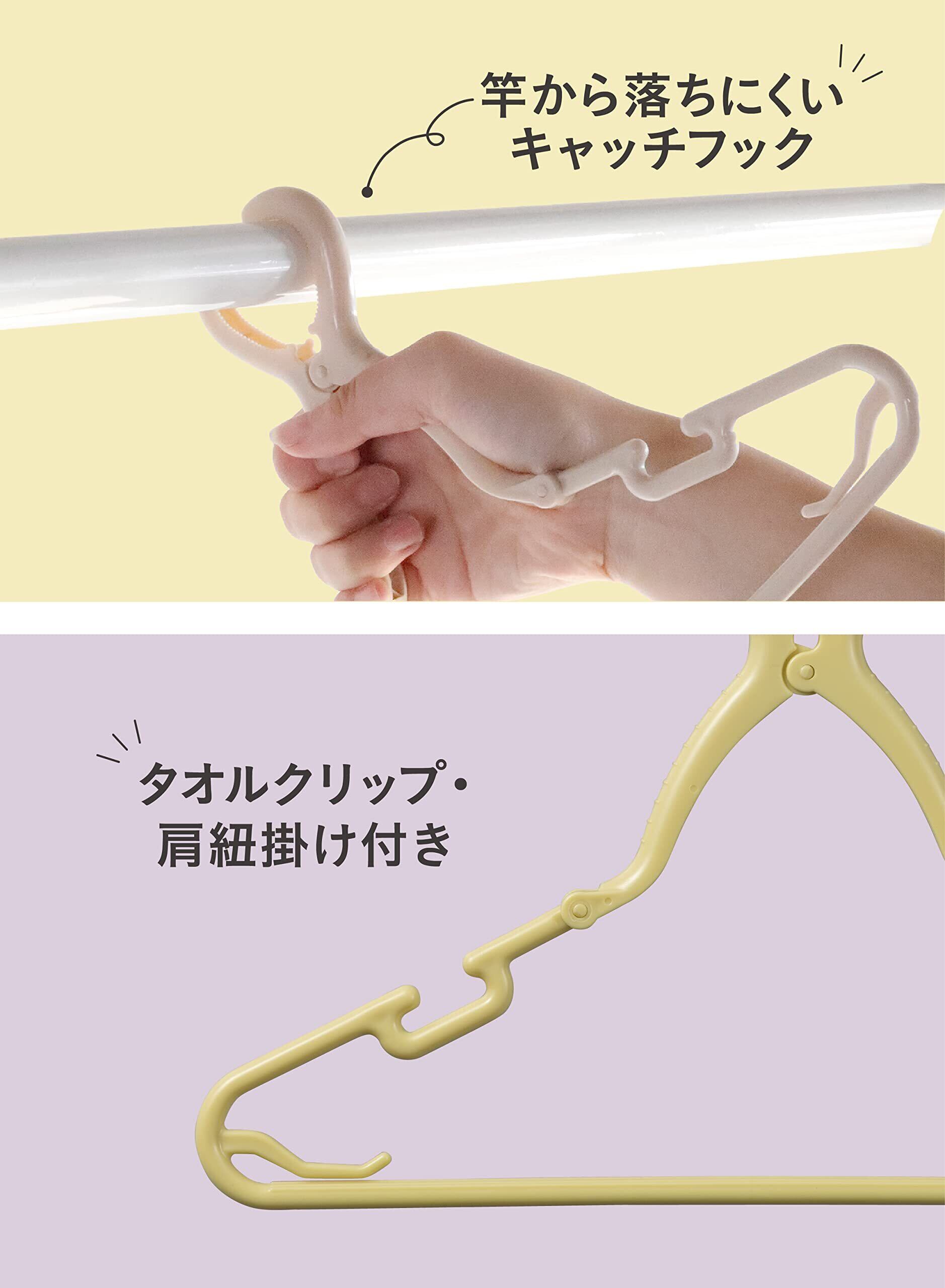 肩部分が動くから、首元を伸ばさずに干せます。肩紐掛け付きなので、肌着やワンピースなど滑らず干せて楽ちん