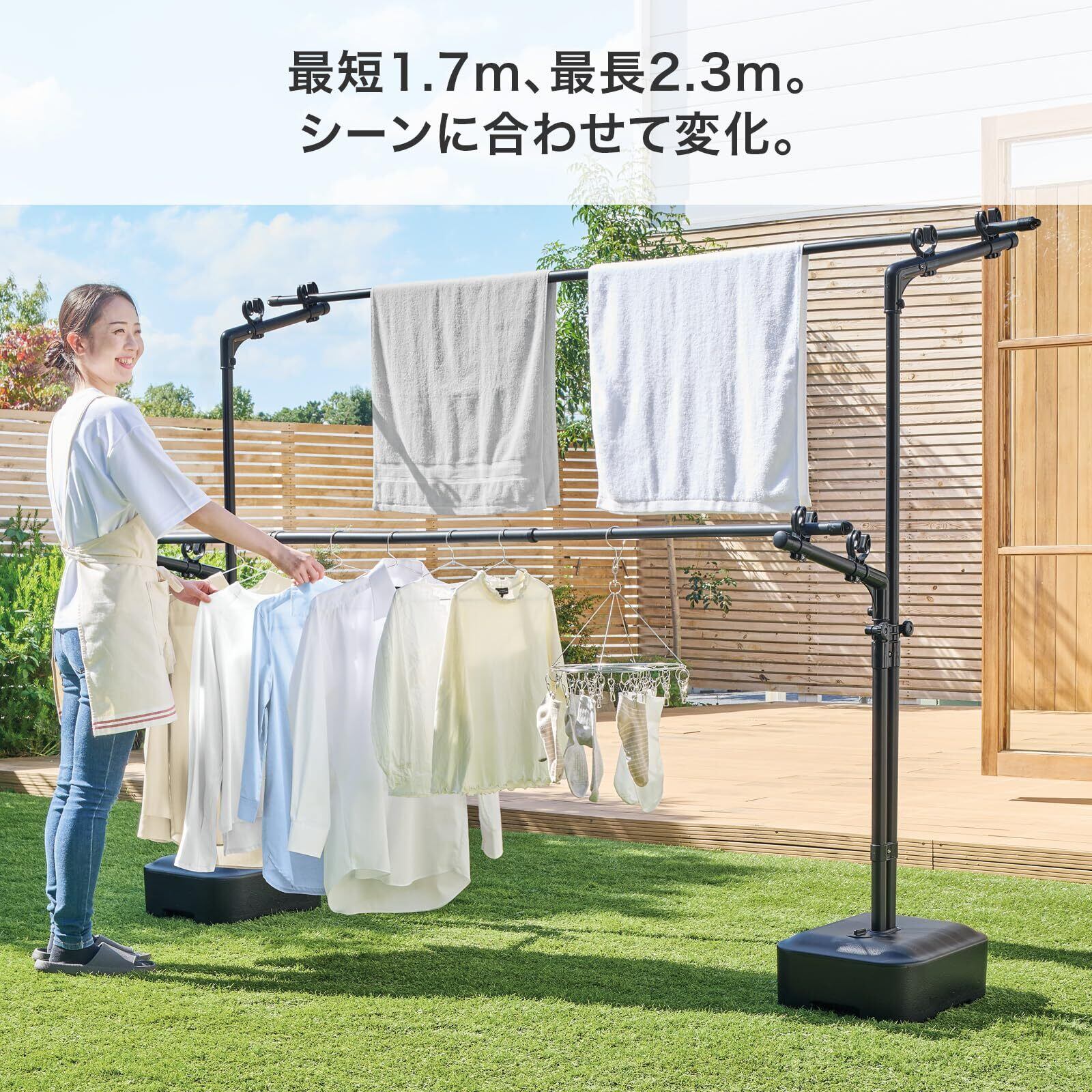 屋外で使えるマットブラックカラーの伸縮竿です。錆に強い塗装をしているので外でもあんしん!工具不要でくるっと回してつなぐだけで組立完了!1.7メートルから2.3メートルまで伸縮が可能。『物干しブロー台付 PSBK-13』に使用いただけます。