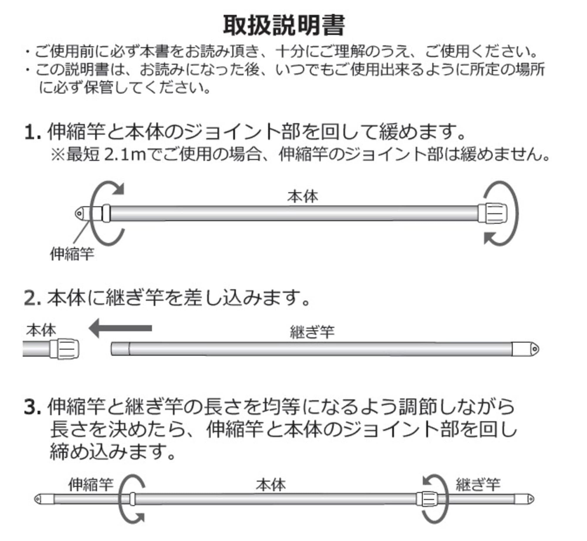 ※本体に継ぎ竿を差し込み、伸縮竿を伸ばして長さを均等になるようにご調整ください。(同封の取扱説明書をご確認ください)