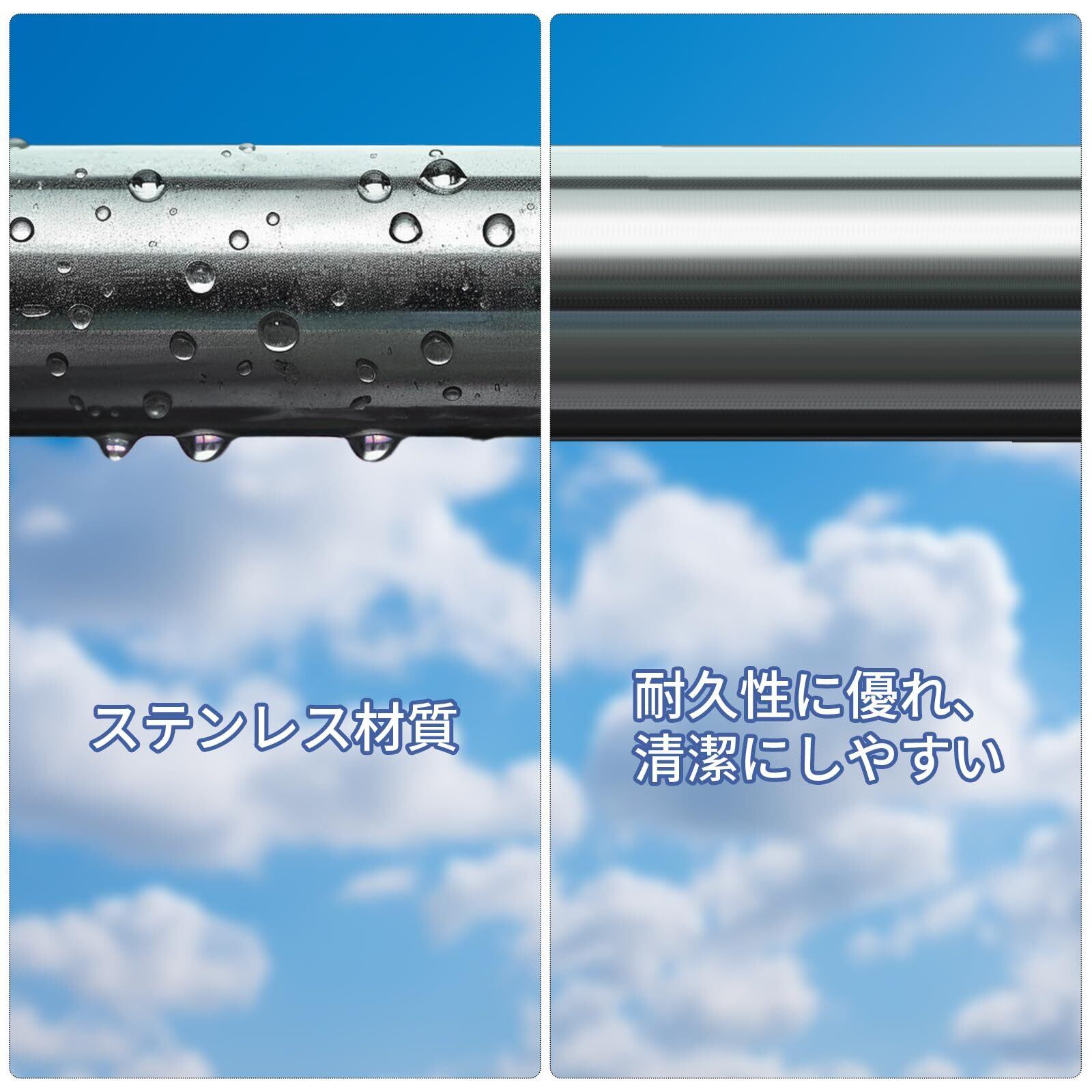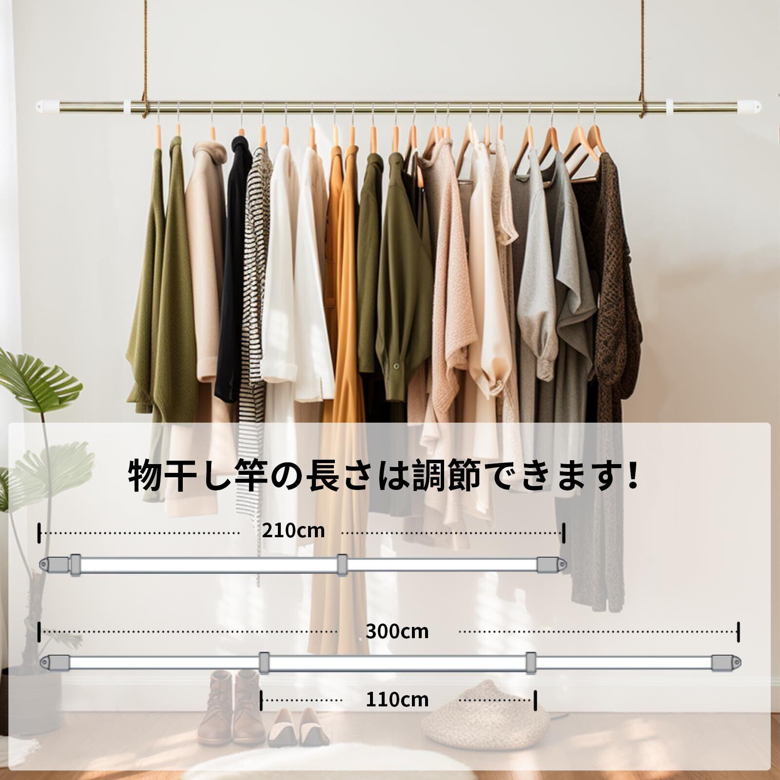 【製品の詳細】:サイズ: 直径2.94cm×長さ2.1m~3m、本体重量:約1Kg(1本)、フレーム部分素材:高級な304ステンレス、キャップ部分素材:ABS樹脂、パッケージ内容:物干し竿x2本 3m 。0.5mm厚さのパイプで安定感抜群、最大荷重力10KG。