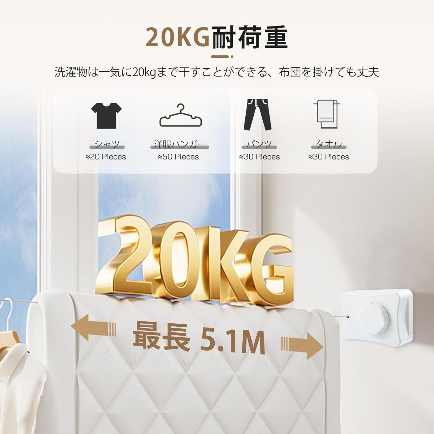 【数量限定】室内物干しワイヤー 洗濯用ワイヤー 乾燥ラック 耐荷重40kg ワイヤー全長5.1M 伸縮式物干しロープ 内蔵タイプ ステンレス 部屋壁掛け 自由伸縮可能 自動卷き取り式 室内物干し 隠し物干し用ロープ 防水防錆 壁付 梅雨対策 省スペース収納 室内屋外兼用 取り付け簡単 1-5人適用 (ロープ1本 ホワイト)
