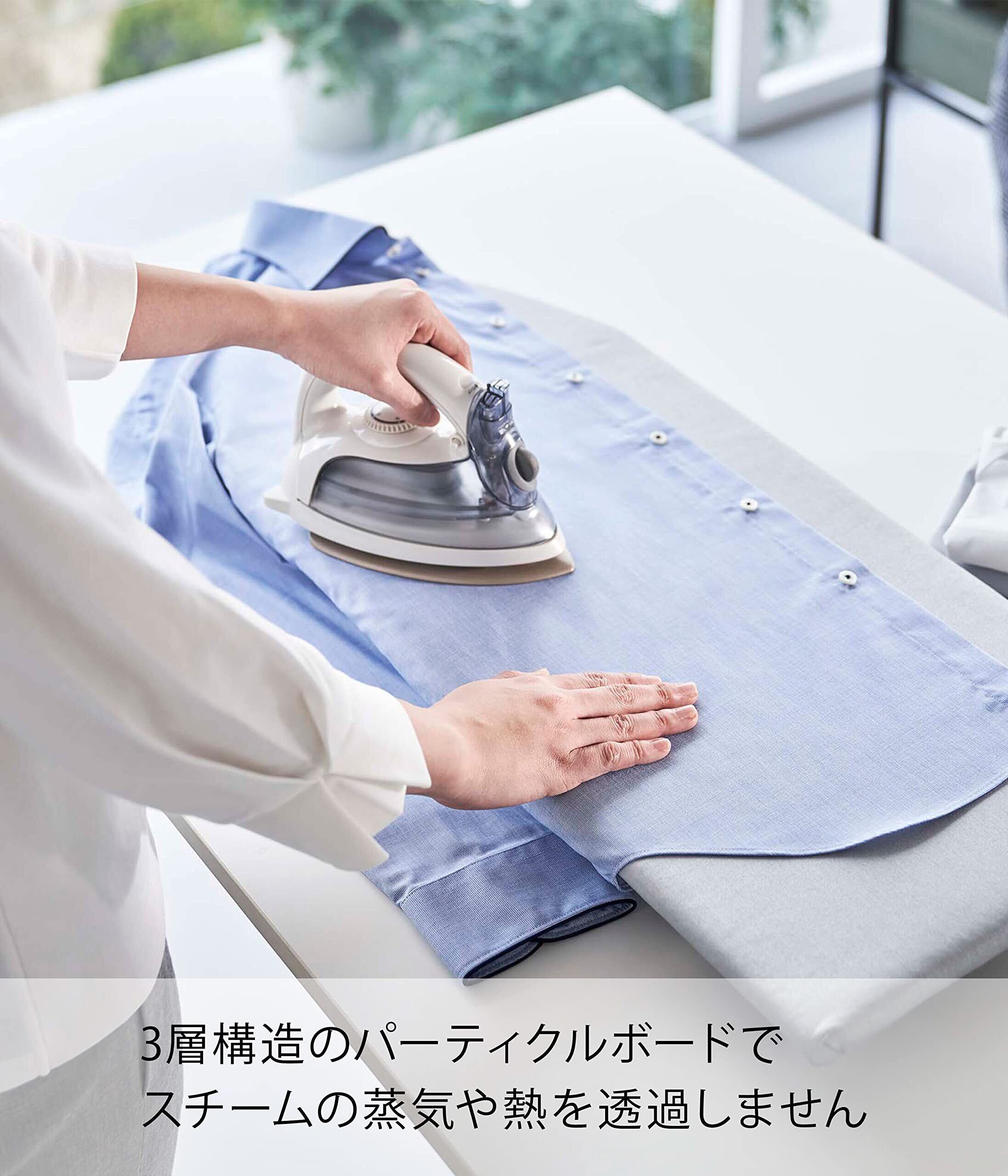 卓上でスチームアイロンが快適に掛けられる、すべらない脚付きアイロン台 3層構造のパーティクルボード製の天板だから、スチームの蒸気や熱を透過せず、テーブルを傷めません。