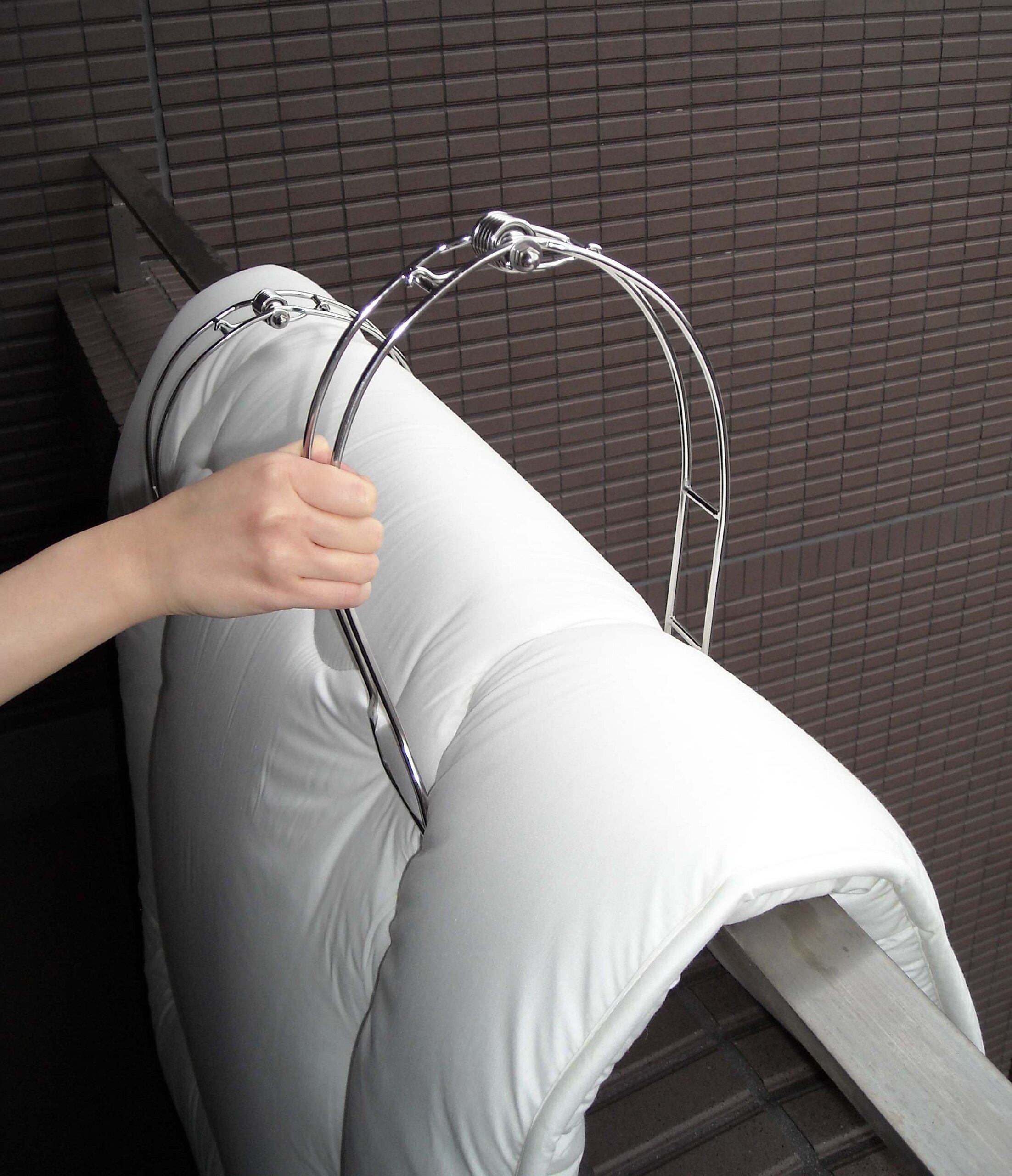 ふとんばさみを片側長くすることで、弓矢のように引き当てて広げられます。スプリングまですべてステンレス製で作ることで劣化の心配がありません。