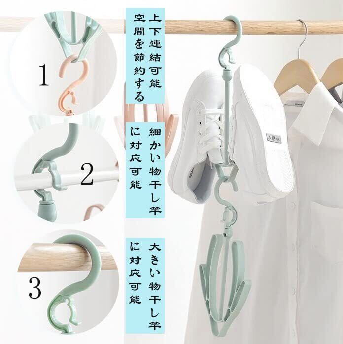シューズハンガー2個付き:360度回転できたシューズハンガーが付いていて、靴は洗った後すぐに排水できて、靴をより早い干すことができます。雨の日に室内の靴干しも対応できます。地べたに置くより早く乾くしので,靴が臭くなりません。上下連結の設計により、スペースを節約することができます。 靴や靴ひもを乾かすだけでなく、スカーフや帽子を保管することもできます。