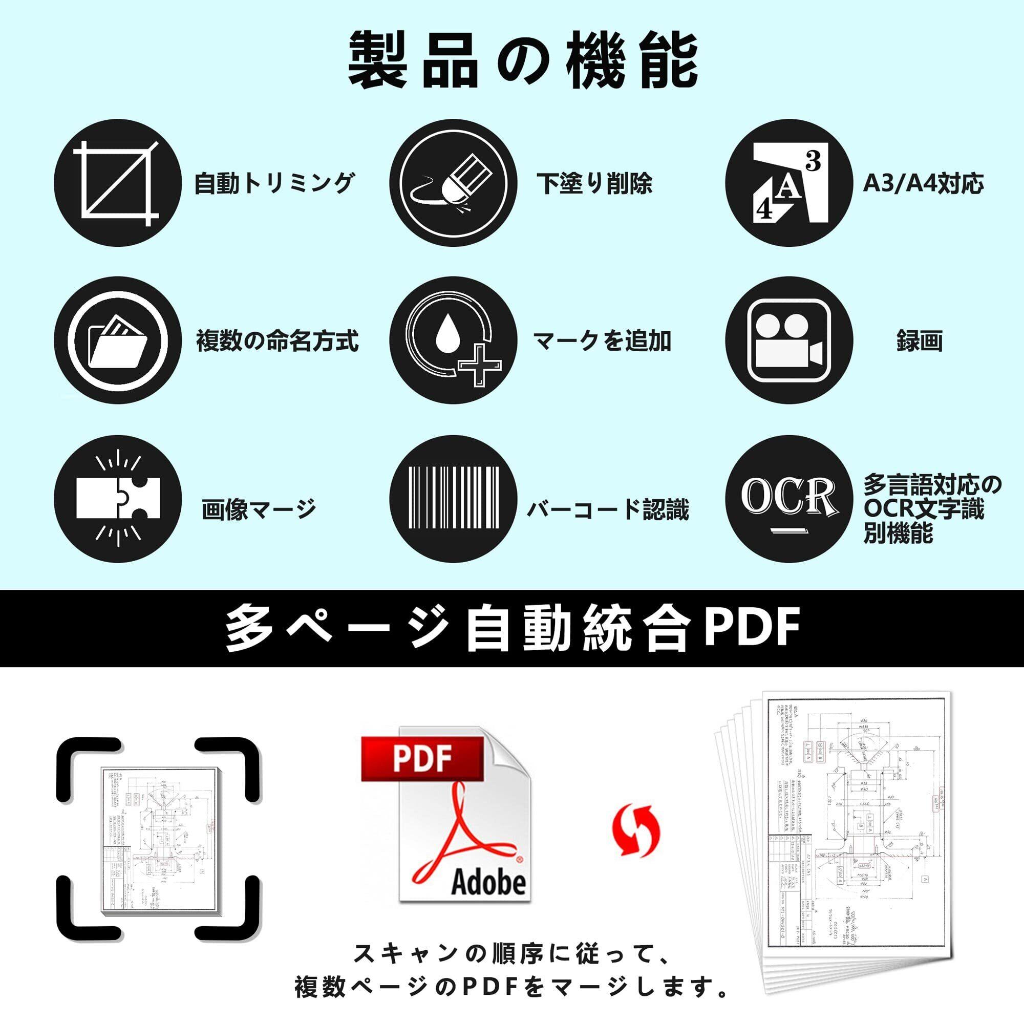 【高速スキャン】このドキュメントスキャナーは1200万画素、最大A3サイズまでのスキャンに対応しており、ドキュメントを全体的にクリアにスキャン可能です。スペースが限られているところでも、手軽にスキャンできます。また、6つのLEDライト付き、夜でもで撮影時の補助光源として使用できます。
