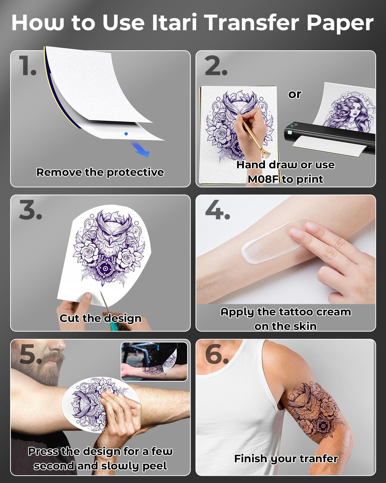 [専用タトゥーステンシルペーパー]: このタトゥーステンシルペーパーは、タトゥー、トレース、肌に画像を転写するのに最適で、汚れにくいです。転写紙はわずかに厚いインク転写層を備えており、印刷品質がより一貫して予測可能です。鮮明な線でうまく印刷され、肌に転写しやすいデザインです。