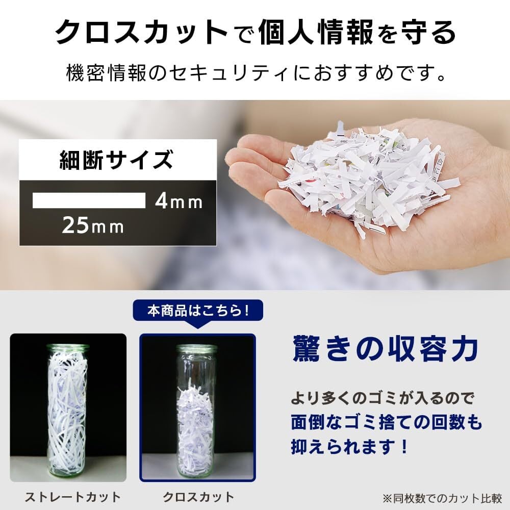 ●最大細断枚数:A4コピー用紙(上質紙64g/m2):6枚、●定格最大細断枚数:A4コピー用紙(上質紙64g/m2):5枚