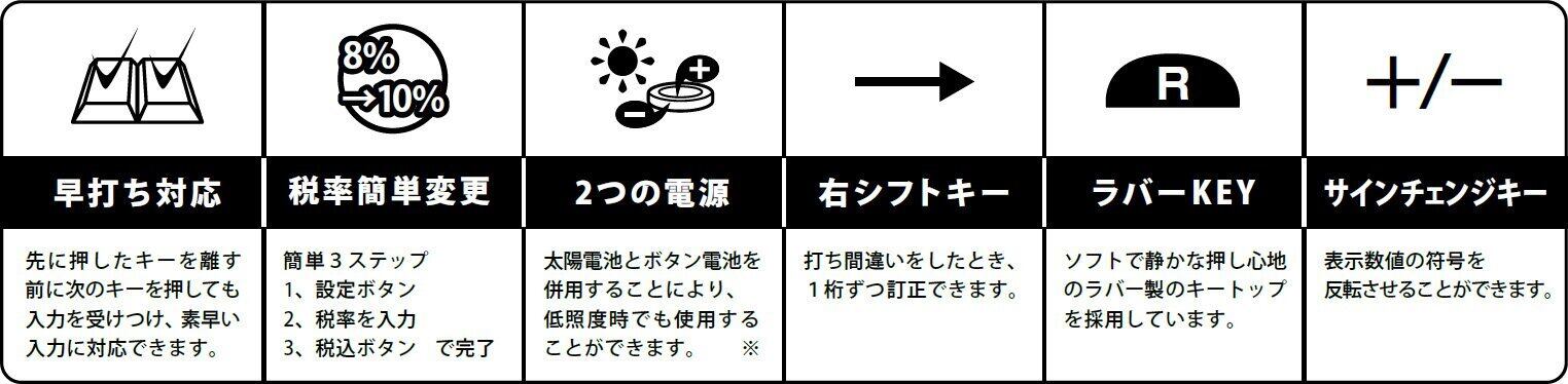 機能:生活防水(IPX3)/12桁表示/税計算、早打ち対応/2つの電源