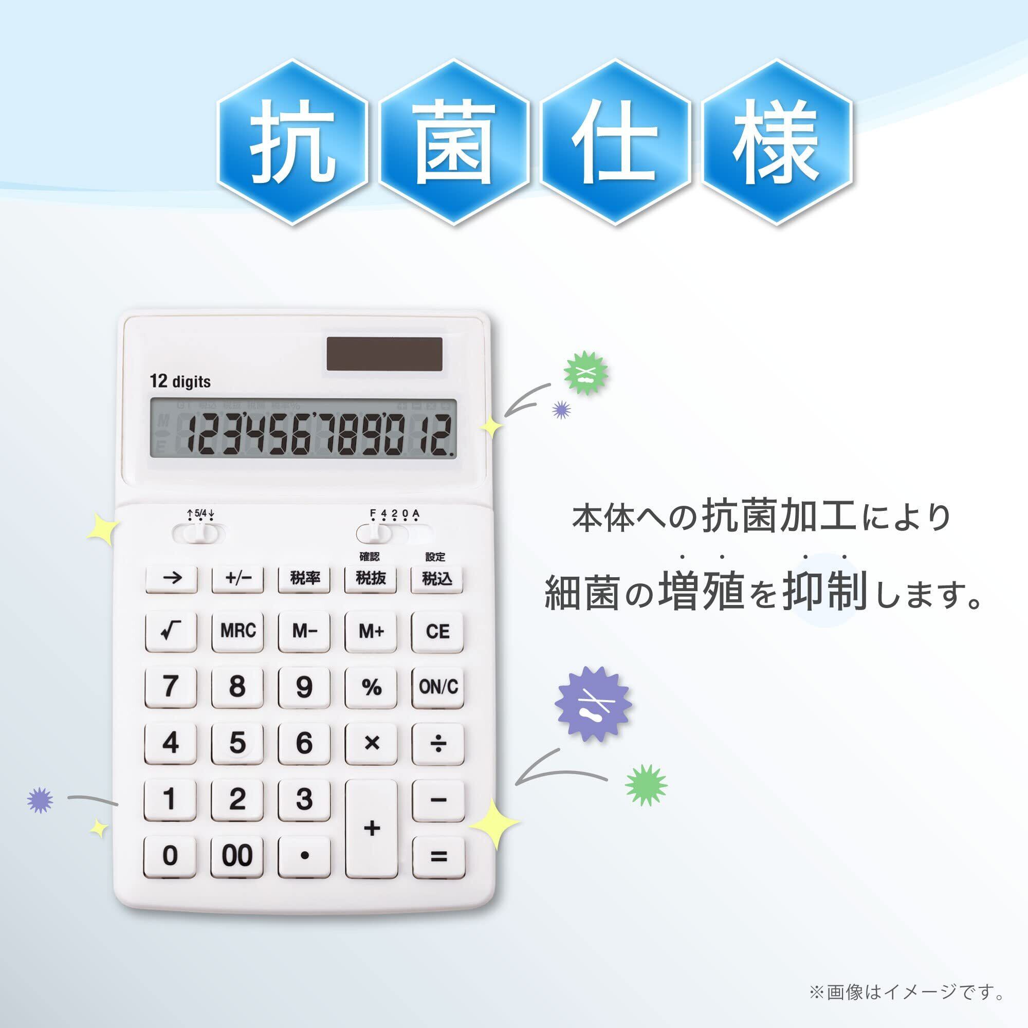 ●抗菌特性を持った電卓。細菌の発生や増殖を防ぎます(JIS Z 2801:2012)。(細菌の発生や増殖を抑制する効果はありますが、すべての抗菌をするものではありません)●傾斜角度が変えられるチルト機能付き●使用電源は太陽電池とボタン電池の2電源●12桁、税計算、メモリー、矢印キー、ルートキーあり