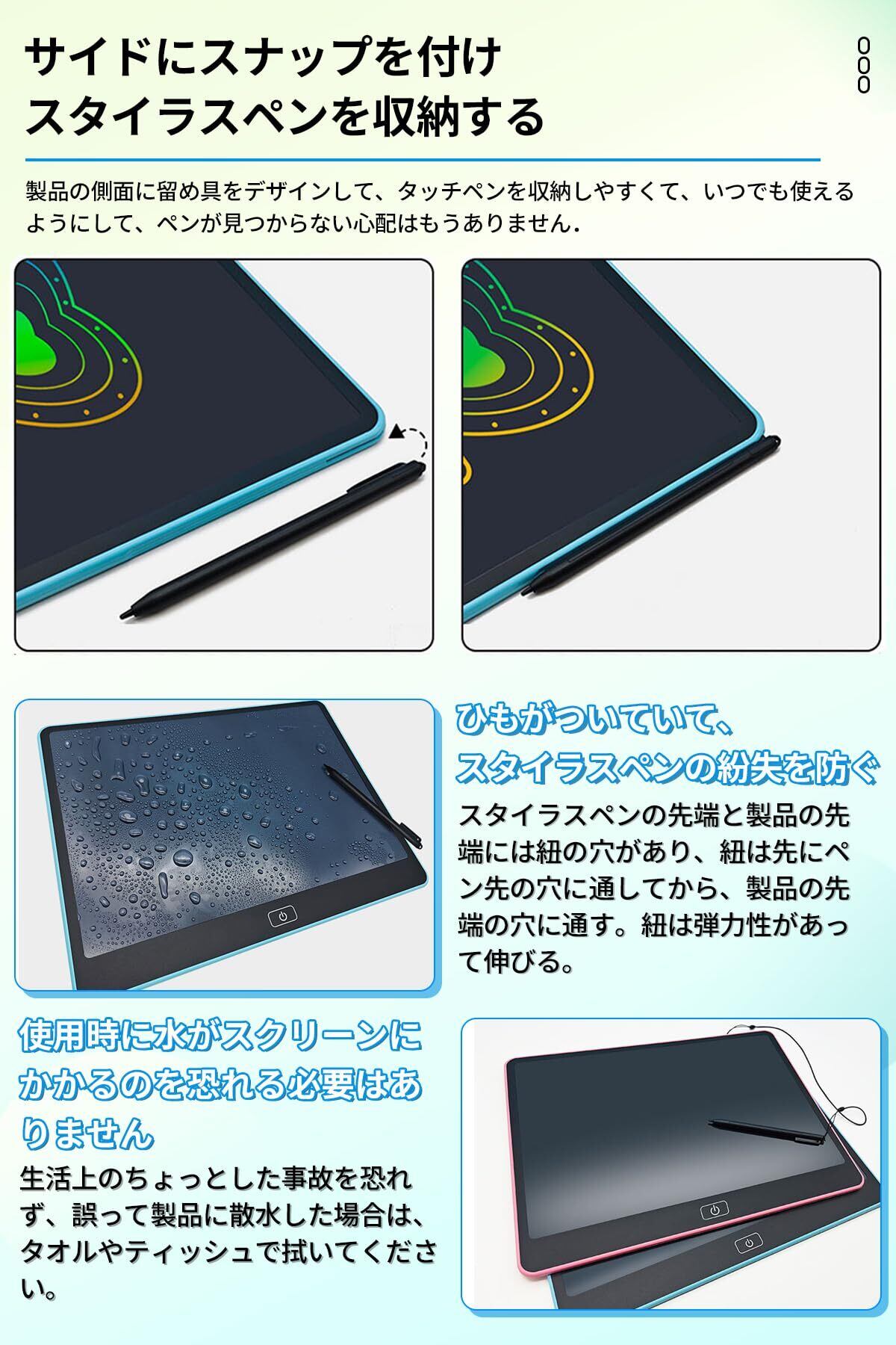 【製品仕様】サイズ:16インチ/外径寸法:330×250×8mm/液晶寸法:310×215mm/材質:ABS、POM、LCD液晶/セット内容:本体×1、スタイラスペン×1、ボタン電池(CR2025)1個、説明書×1。新しいマットな質感、シンプルな黒のボーダー、快適な丸いエッジのデザイン。7mmの超薄型ボディ、わずか300g、このデジタルメモパッドは、特別な耐衝撃性のABS素材でできており、損傷しにくい頑丈なケーシングを備えています、1メートルで落としても壊れず。ペン本体はpom素材でできており、耐摩耗性、耐熱性、耐衝撃性があります。ペン本体の表面がなめらかで握り心地が良く、長時間の書き込みでも疲れにくいです。お子様にもお使いいただけます。ペンの紛失を防ぐため、筆談ボードの右上にペンスロットを設計しました。軽量で持ち運びに便利なデザインで、旅行の負担を軽減し、いつでもどこでも便利に使える!