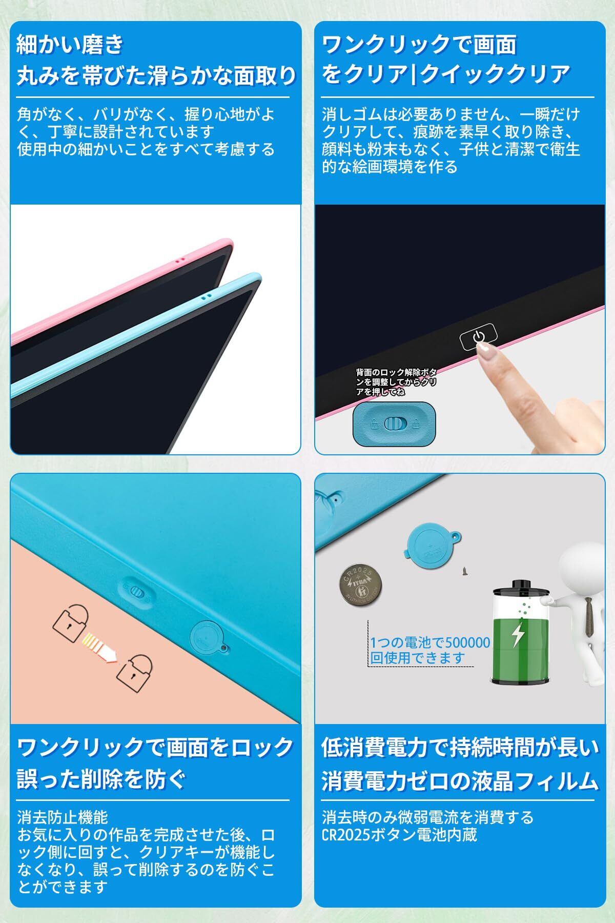 【ワンタッチで消去●低消費電力】電子パッドにはスイッチング電源がなく、いつでも書き込むことができ、使いやすいです。付属のスタイラスペンを取り出して、液晶部分の書き込みエリアに直接書き込んでください。メモパッドの中央ボタンをクリックすると、1つのキーで画面の内容を簡単に消去できます。機密事項や顧客情報を即座に削除できるため、情報漏えいを防ぐことができます。ロック機能は、偶発的な削除を回避し、ワンクリックで瞬間をフリーズし、あなたの創造性を保持し、共有します。当社の16インチ大画面電子パッドは、500,000回以上再利用できるため、紙のコストを削減できます。書き込み中は電力を消費せず、画面をクリアするときも電力をほとんど消費しないため、頻繁にバッテリーを交換する必要はありません。(電池カバーはネジで補強されているので、コイン電池が滑り落ちず、お子様にも安心です。)DAIDAIZAIデジタルメモは、環境に合わせて設計されています。