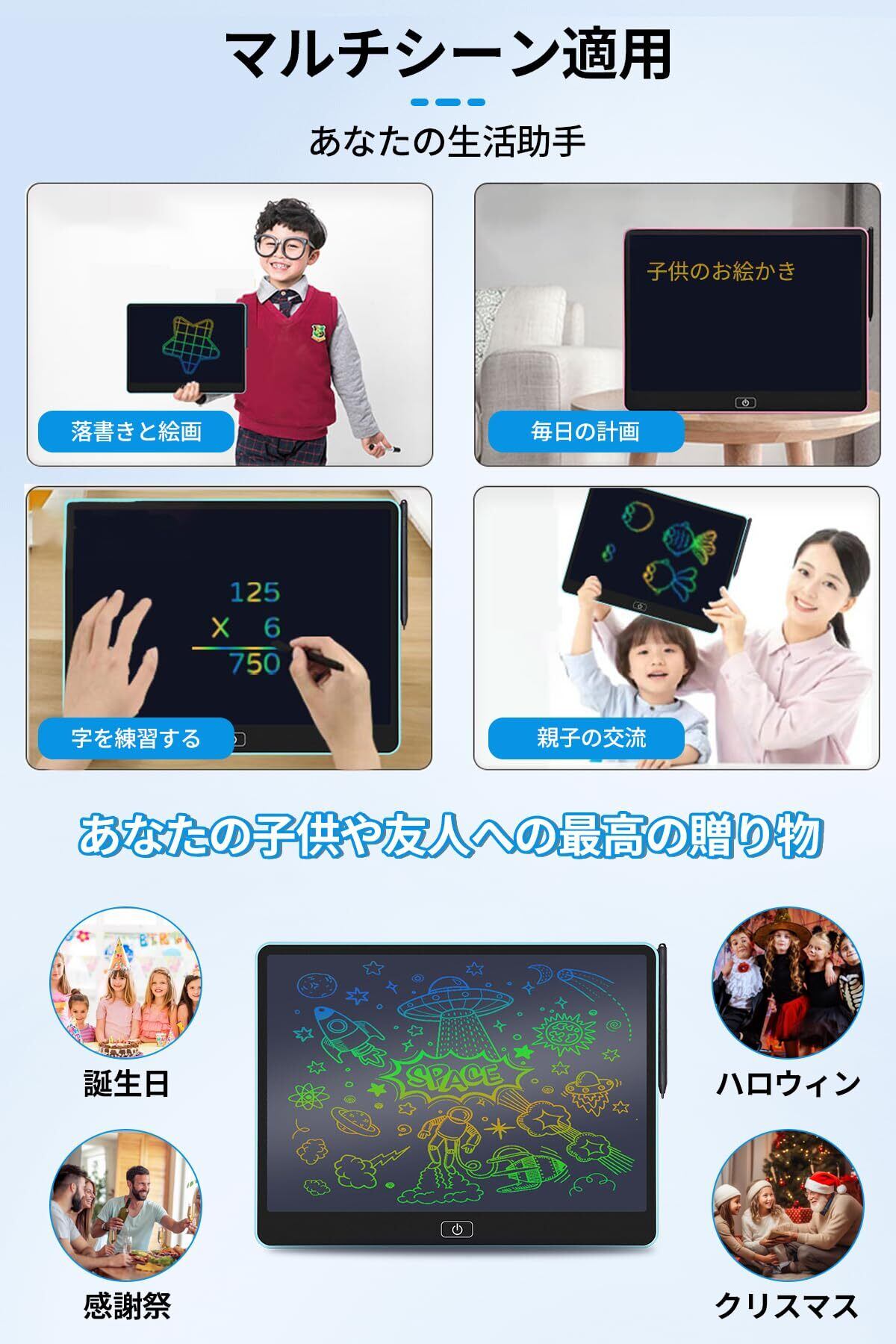 【広く使われている16インチ電子メモパッド】この電子メモは、あらゆる年齢層の方に適しています、さまざまなシーンで使用できます。ビジネスマンはビジネス交渉(ビジネスプランの完成)、会議の議事録/やることリストの作成、電話メモの作成、インスピレーションの取得、マインドマップの描画に使用できます。学生は数学計算、描画、単語の口述に使用できます。子供は次のことができます。落書きを描いたり、子供の想像力と創造性を育んだりするために使用されます。親と教師は、それを早期教育ツールとして使用したり、子供たちが宿題をするのを手伝ったりすることができます。また、聴覚障害者のための日常のコミュニケーションツールとして使用することもできます。磁石と一緒に使用すると、冷蔵庫に取り付けて、メモボード、メッセージボード、ショッピングリストとして使用できます。これは、子供、学生、デザイナー、ビジネスマン、教師、学生、芸術家へのプレゼントに最適です。DAIDAIZAI電子メモは、学習、作業、創造性を次のレベルに引き上げるように設計されています。