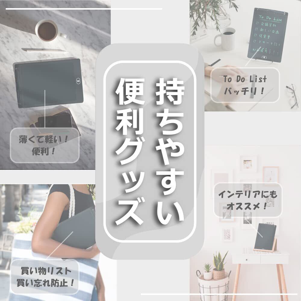 より見やすく進化したスタイリッシュモデルスイスイ書いて、パッ! と消す感圧式液晶を採用。筆圧で文字の太さが変化します。軽くて薄く持ち運びに便利な、新感覚の電子メモパッドです。ペーパレスでエコ。職場や学校・ご自宅で、電子メモパッドは活躍します。ワンタッチで画面の消去が可能。※画面は消去ボタンを押すまで保持されます。【スタンド機能】付属のスタイラスを差し込めばスタンドとしても使用できます。