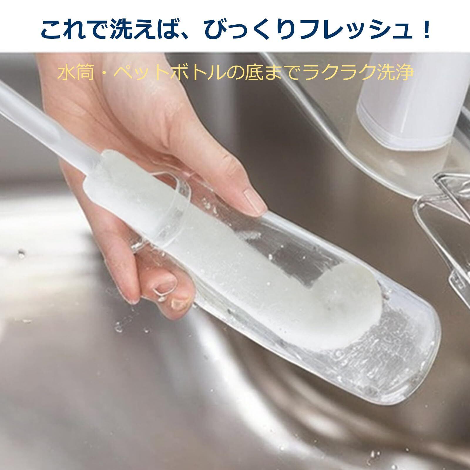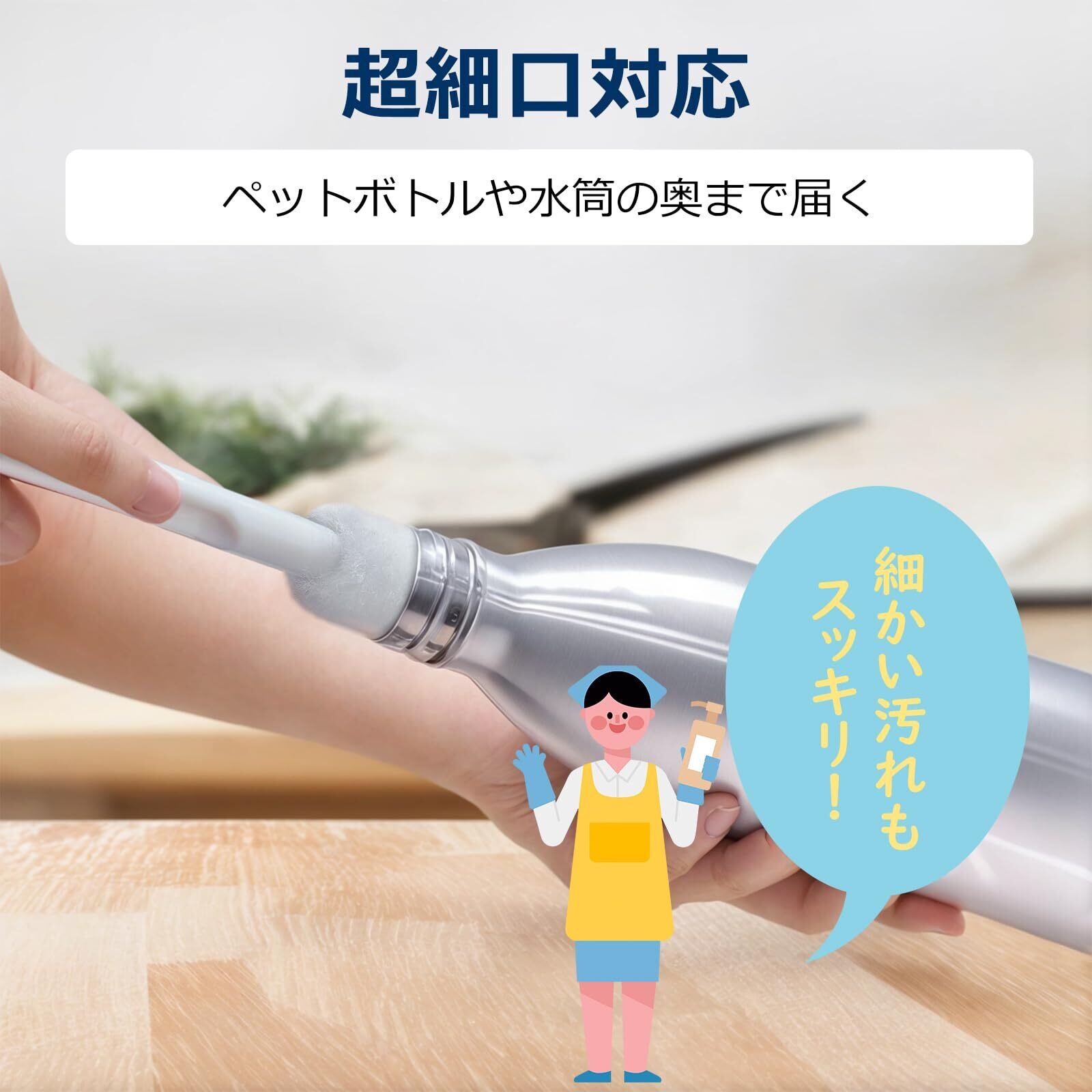 『細口専用設計』 - 水筒、タンブラー、ペットボトルなど口の細い容器の底まで届く絶妙な長さと柔軟性で隅々までピカピカに