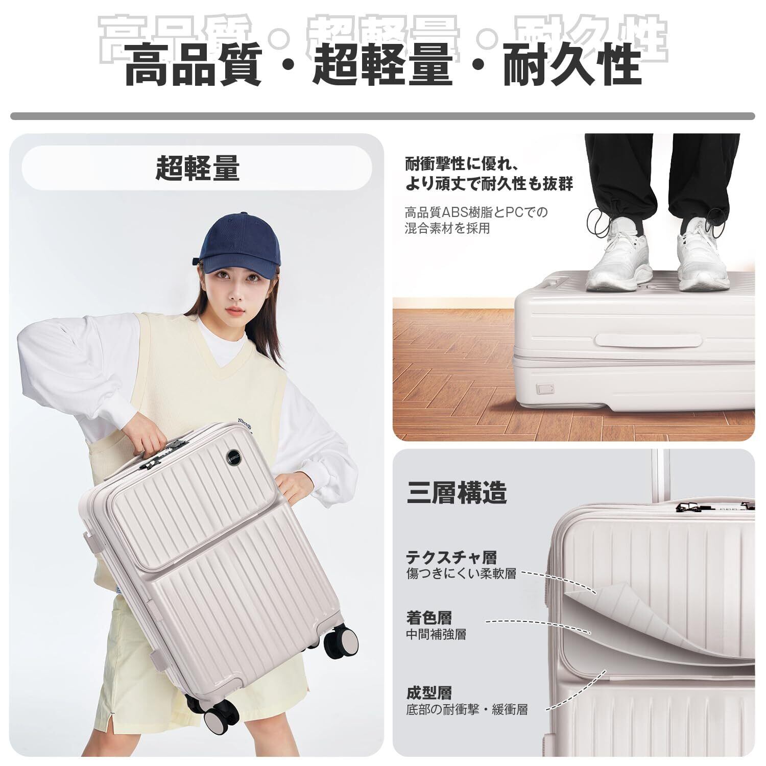 【トップオープン式】スーツケースはトップオープン式ポケットを搭載し、メイン収納を開ける必要なく、パソコンやスマートフォンなどの荷物を立てたまま簡単に取り出すことができます。特に出張の方に適しており、必要なものに素早くアクセスでき、仕事の効率を向上させます。更に物掛けフック式底足付きで手荷物を掛けて気楽に移動でき、旅行中の手への負担を軽減します。※鍵穴は航空会社検査専用の物です。本製品に鍵は付属しておりません。