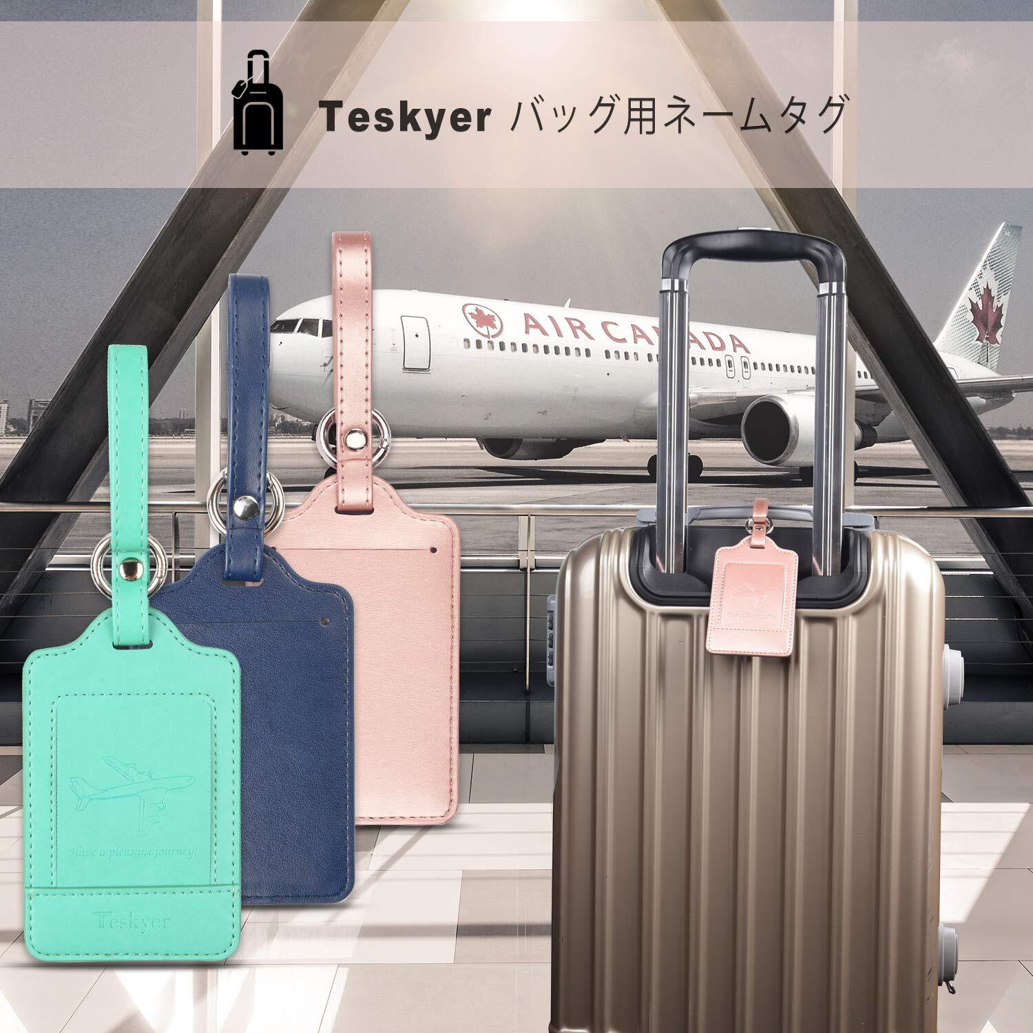 Teskyer 荷物タグ スーツケースタグ 出張用タグ ネームタグ 番号札 バッグ用ネームタグ レザー 旅行タグ トラベル用 旅行手荷物 ラベル 紛失防止 三枚入り(ネイビー+ローズゴールド+グリーン)