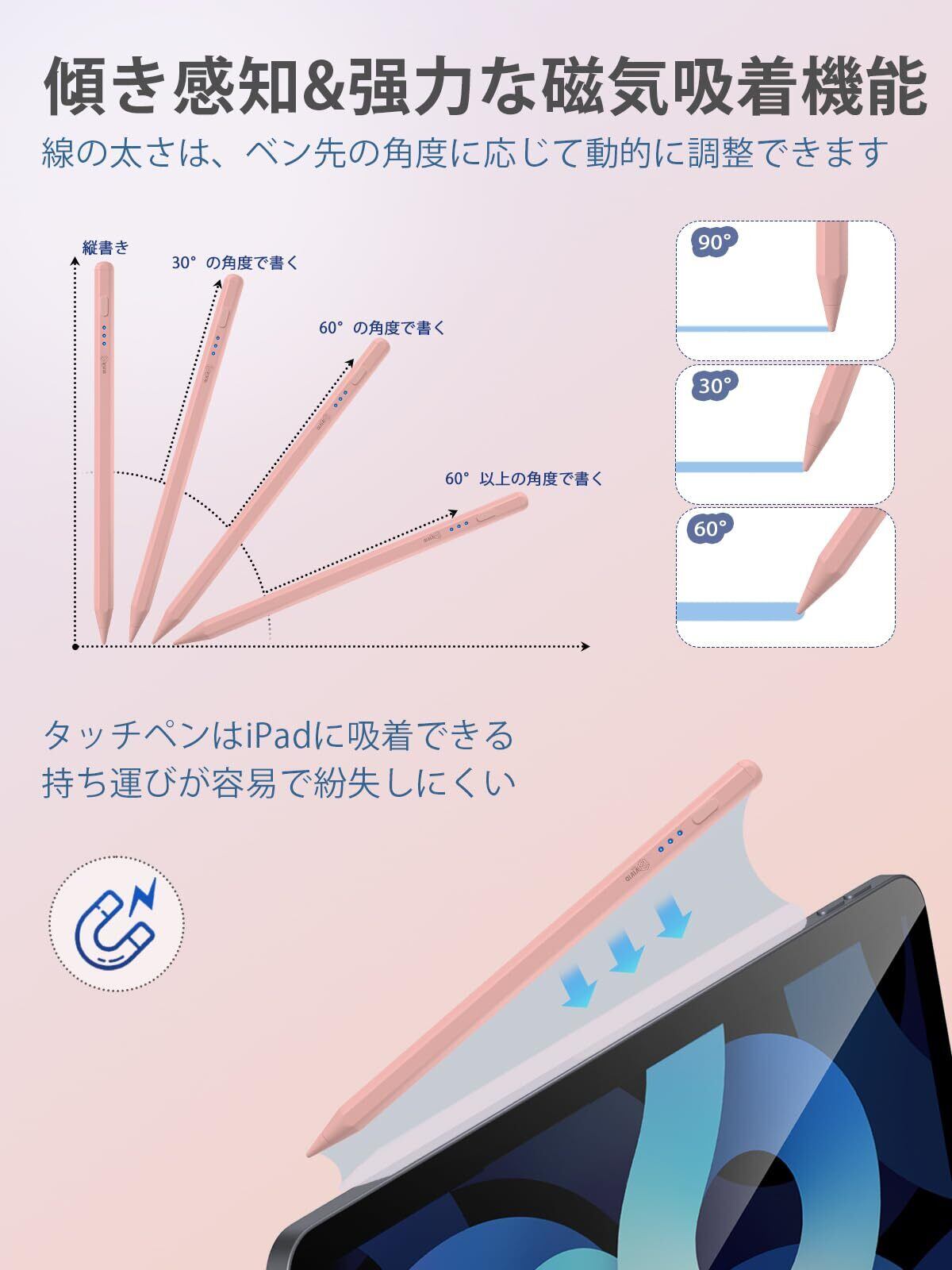 【磁力吸着&誤タッチ防止&傾き感知】Vivid Tech iPadタッチペンには2つの強力なマグネットが内蔵されており、iPadにしっかりと吸着させ、収納しやすくなっています。出張や会議などの場面で携帯することも可能です。 Vivid Tech iPadタッチペンには誤タッチ防止機能が備わっており、手を自由に置いて紙で描くように感じることができます。手袋をつける必要はありません。 Vivid Tech iPadタッチペンには傾き感知機能があり、ペン先端の角度に応じて線の太さを動的に調整することができます。これは絵を描く際に非常に適しています!Bluetoothに接続する必要もなく、面倒な設定は不要です。ペンの先端をクリックして電源をオンオフするだけなので、非常に簡単です。