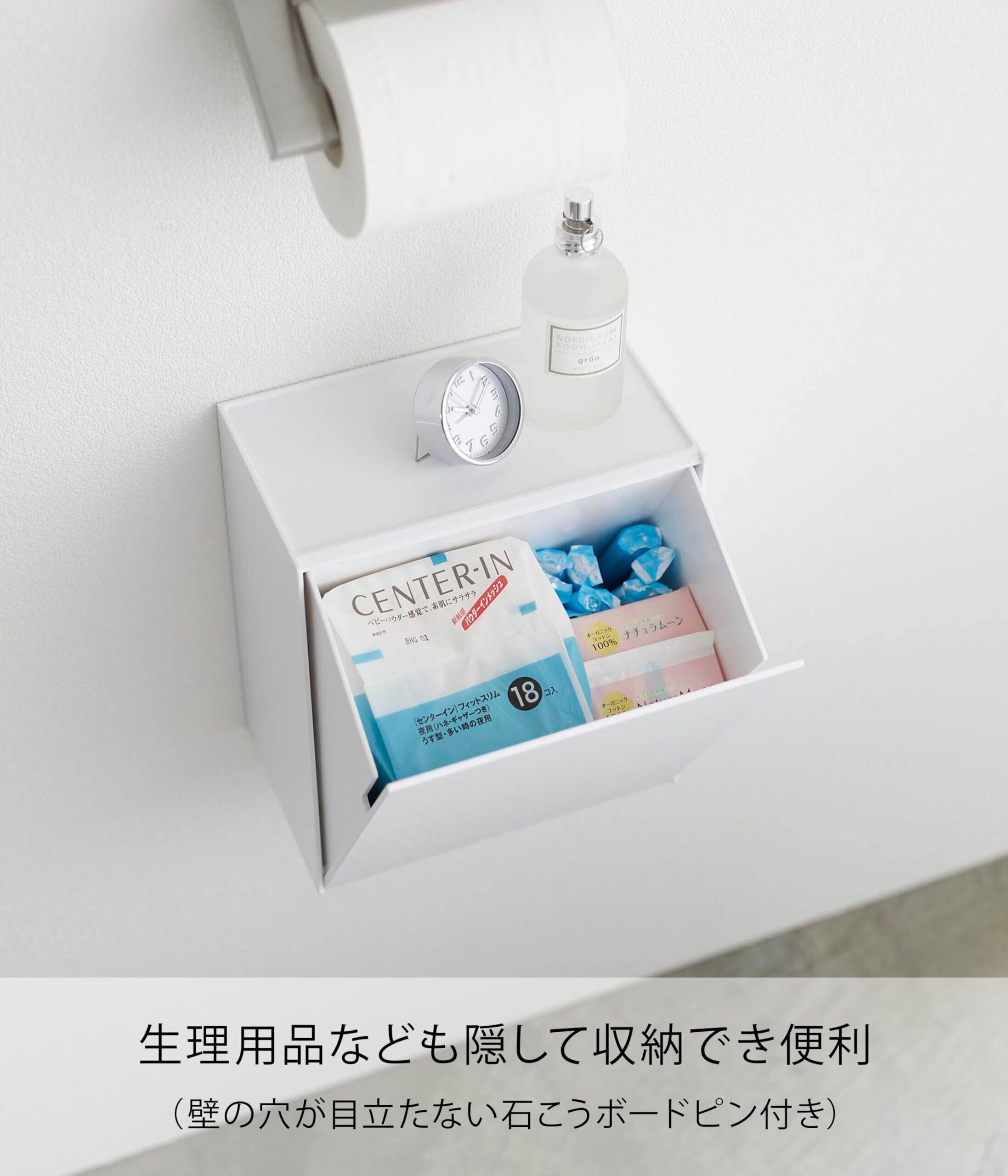 ゴミ箱以外にも収納ケースとして、生理用品などの小物を隠して収納。