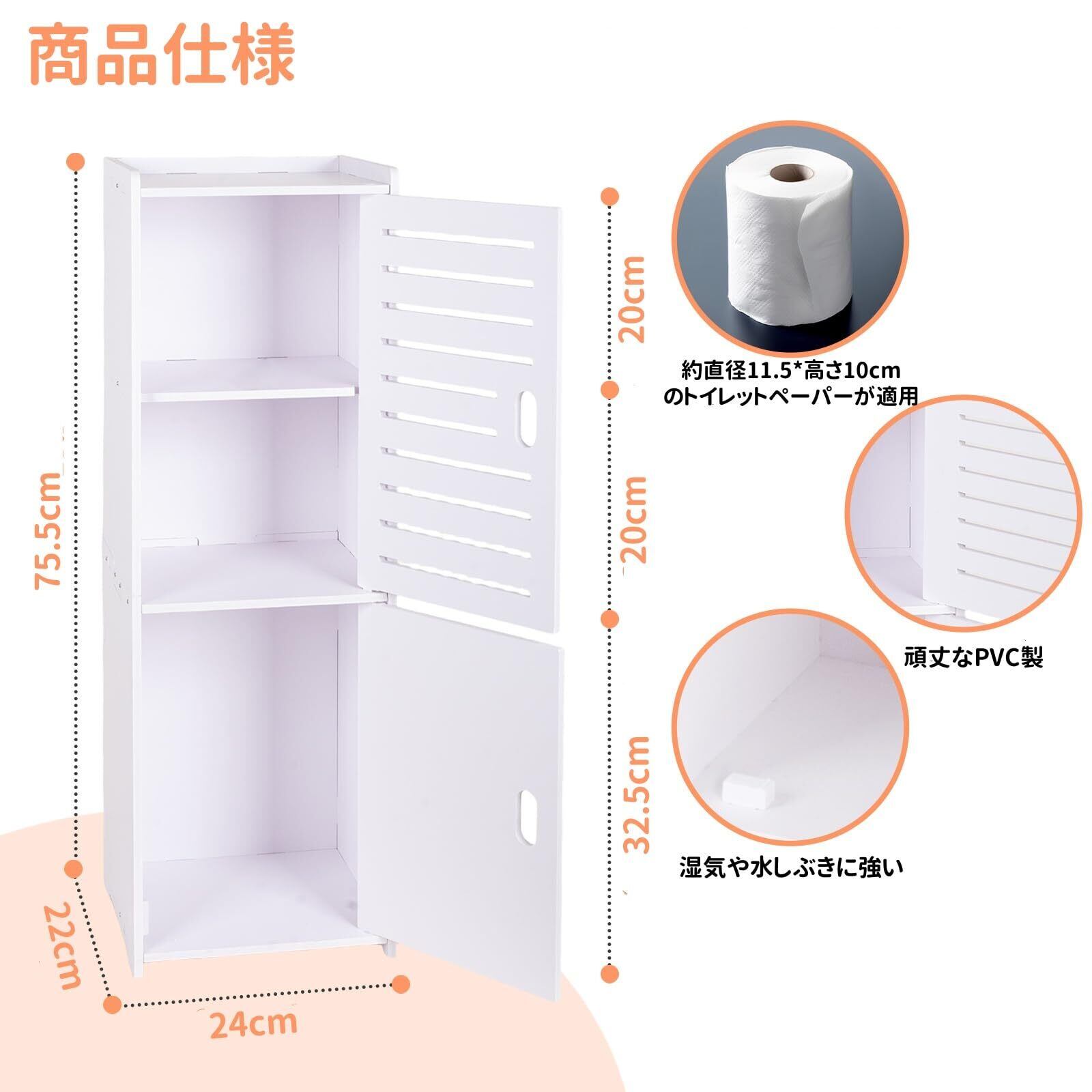 【スリムなデザインで省スペース】サイズは約幅24*奥行22*高さ75.5cmで、スリムなサイズ設計なのに、トイレットペーパーやトイレ用品をひとまとめに収納できる優れもの!縦型のスリムな設計で邪魔にならないサイズ感、省スペースに収納空間を作るため、徹底的にスリムなデザインにこだわりました。