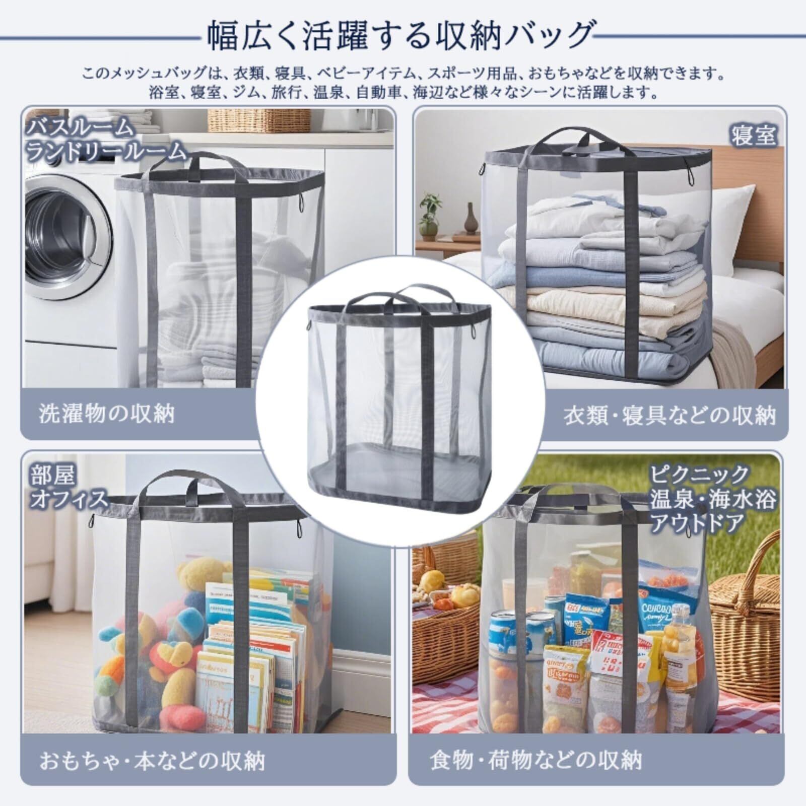 【幅広く活躍する収納バッグ】このメッシュ洗濯かごは、衣類、寝具、ベビーアイテム、スポーツ用品、おもちゃなどを収納できます。家庭用の収納バッグとしては最適です。浴室、寝室、ジム、旅行、温泉、自動車、海辺など様々なシーンに活躍します。また、エコバッグ、プールバッグとしてもご使用いただけます。