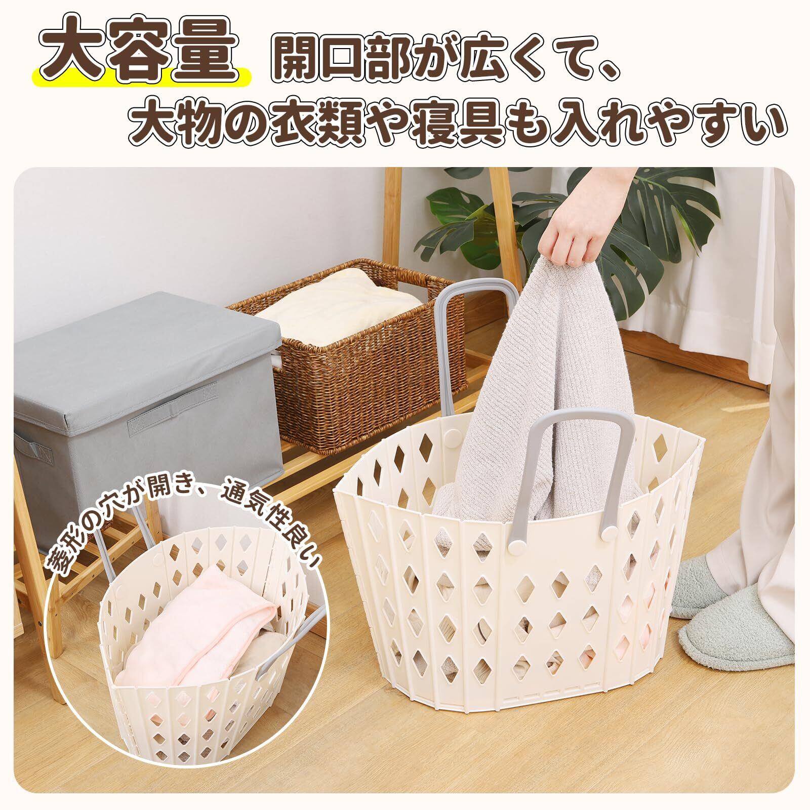 【大容量・衣類が入れやすい】広げると幅約51cmの大容量バスケット。開口部が広くて、衣類とタオルなどだけでなく、毛布と寝具のような大判のものも入れやすい。カラーが二つあり、洗濯物の分け洗いに役立つ。