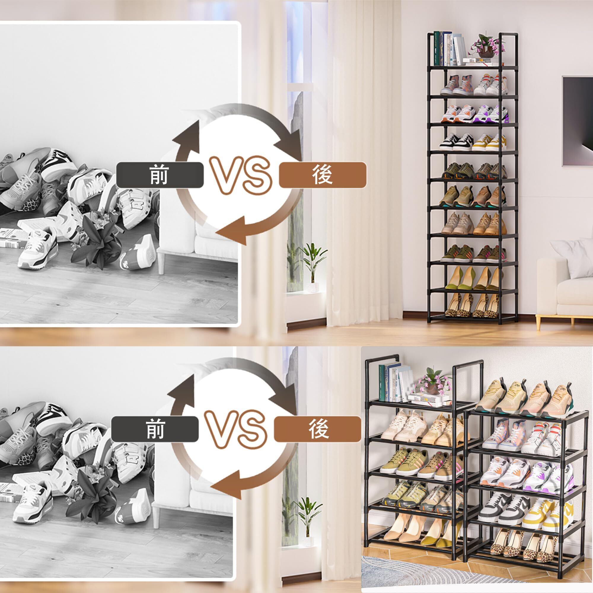 収納・省スペースのシューズラックオーガナイザー: 他のシューズラックより幅狭です。背が高く幅の狭いシューズラック棚は、小さなスペースに最適なサイズで、メタル製シューズラックは、より多くの靴を収納することができます。