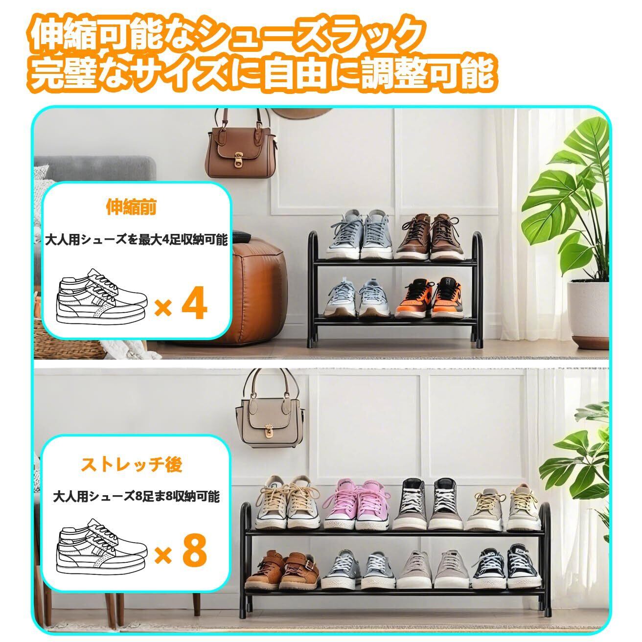 4.【モダンで多芸多才なスタイル】シンプル シューズラック 省スペースの靴棚 でどんなデコレーションともよく合います。 クローゼットの整理またはエントリーレベルの靴保管のニーズに合わせて、2 段、3 段、または垂直の靴棚オプションから選択します。