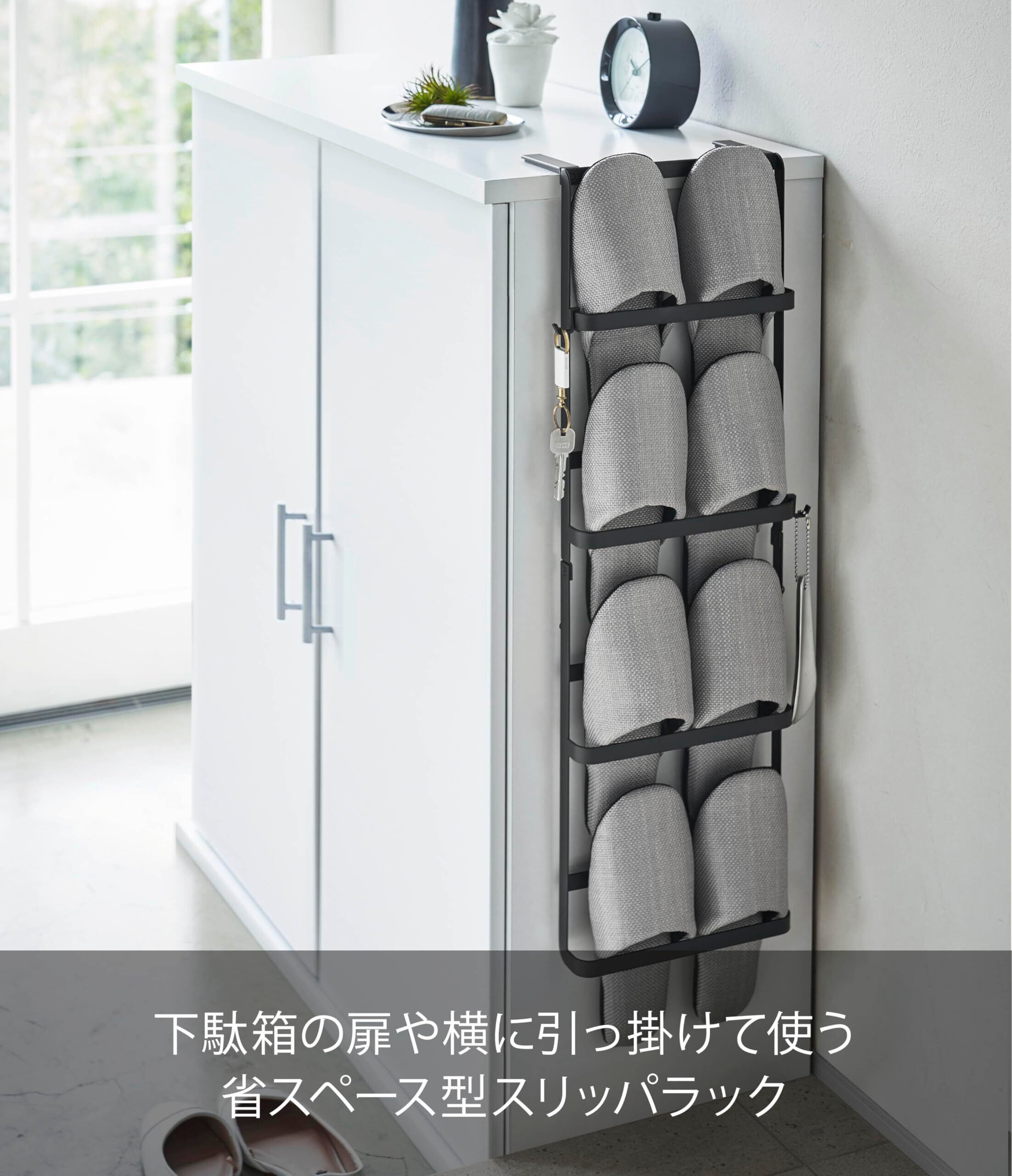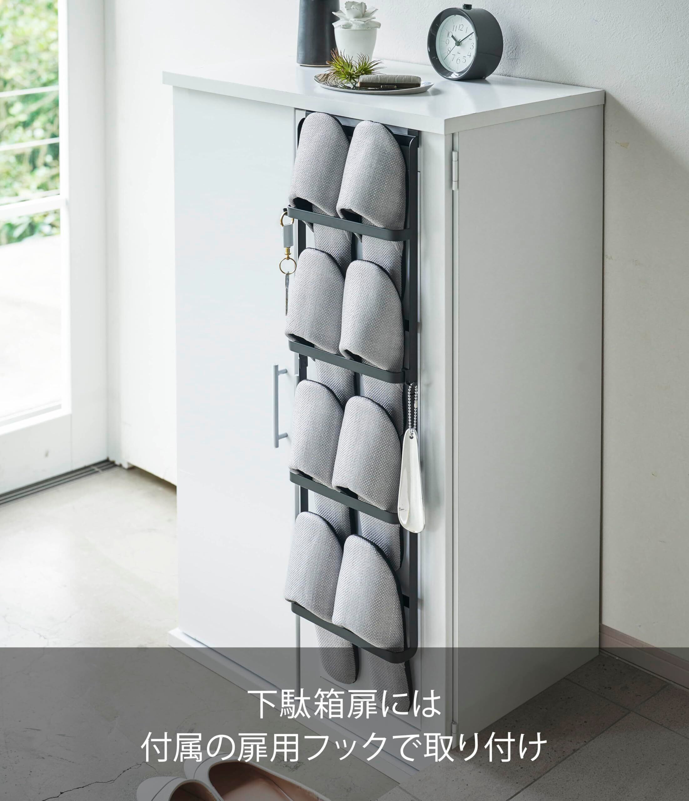 下駄箱の横や扉に引っ掛けて使う省スペース型スリッパラック。
