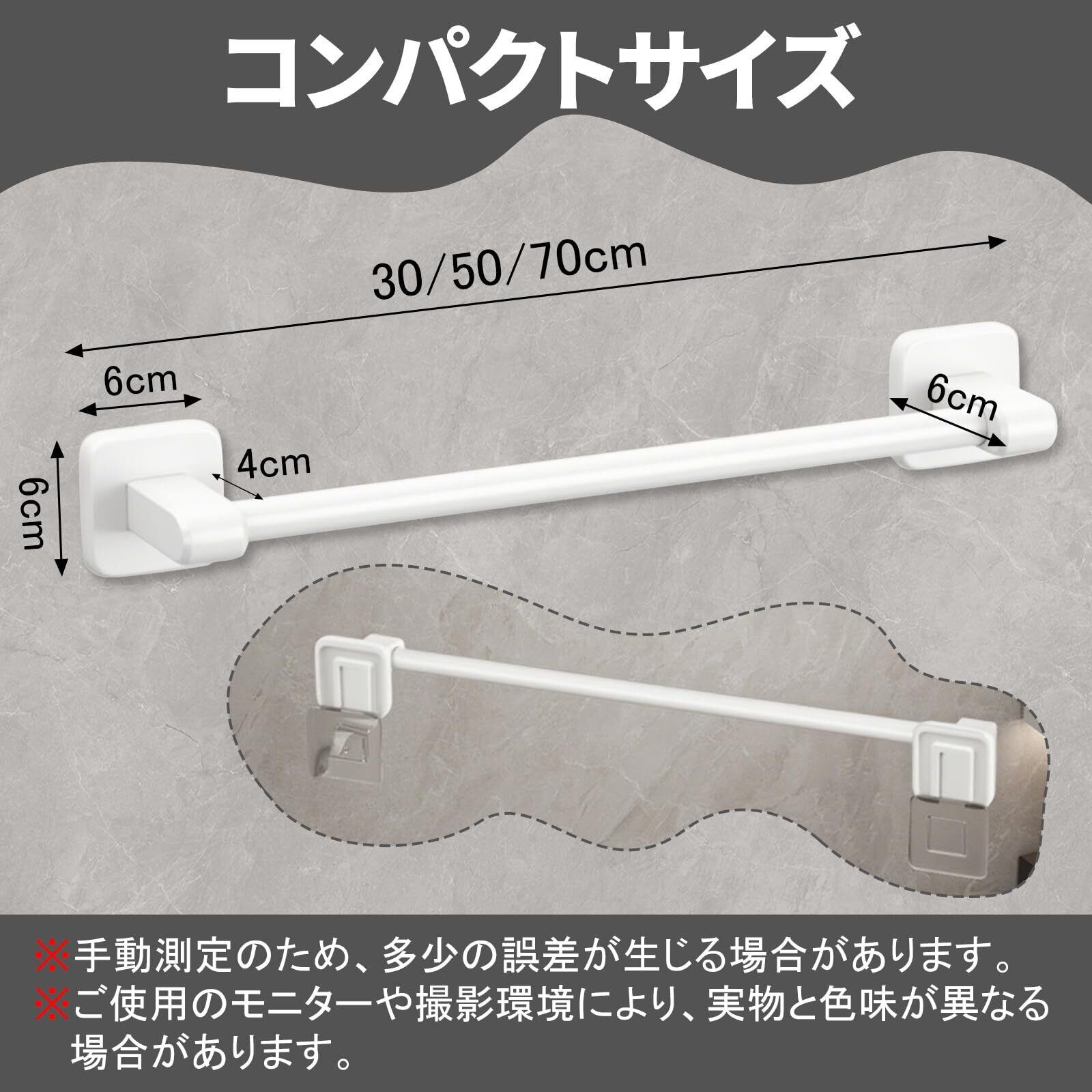 製品名:Syncnika 壁掛けスリッパラック(貼り付け式) 材質:アルミニウム合金+ABS樹脂 カラー:ホワイト サイズ:約50×6×5.5cm 仕様:穴あけ不要・耐荷重8〜10kg 用途:玄関/浴室/洗面所/ランドリールーム/キッチン/ドア裏収納/省スペーススリッパラック ご注意:本製品は手動で測定しているため、サイズに約1cm程度の誤差が生じる場合がございます。あらかじめご了承ください。