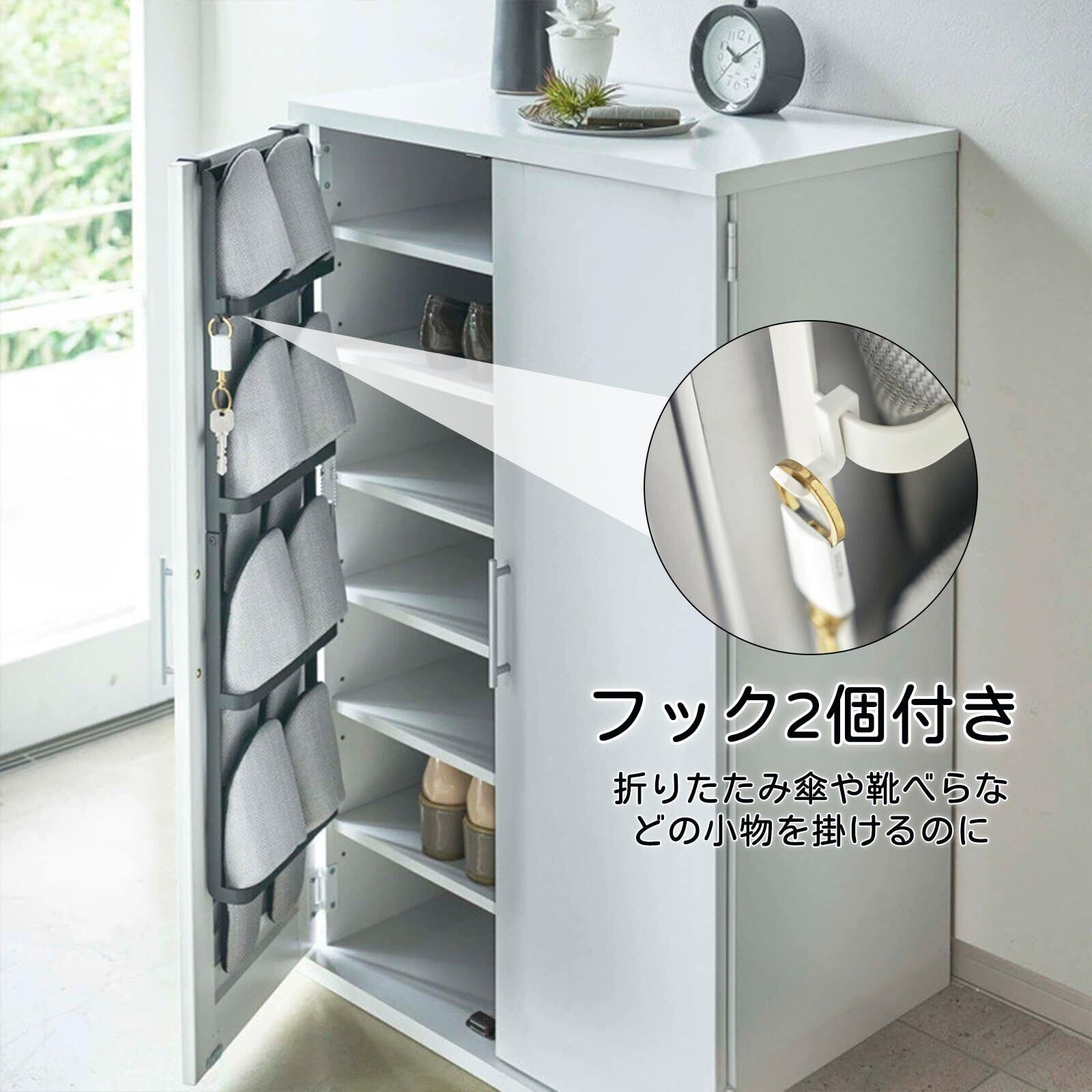 2.【大容量で実用的】: 4段のシューズラックは、サンダルやスリッパをたっぷり収納可能。家族全員のスリッパを一箇所にまとめて、玄関収納をすっきりさせます。フック付きで、小物も一緒に整理整頓できます。