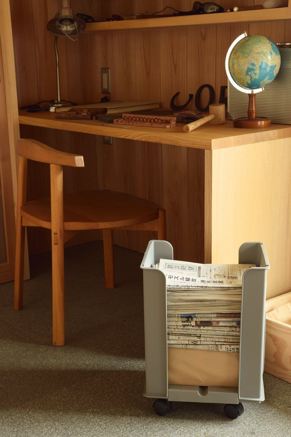 約1か月分の新聞を収納。A4サイズ代の雑誌も収納でき、キャスター付き移動もラクラク。