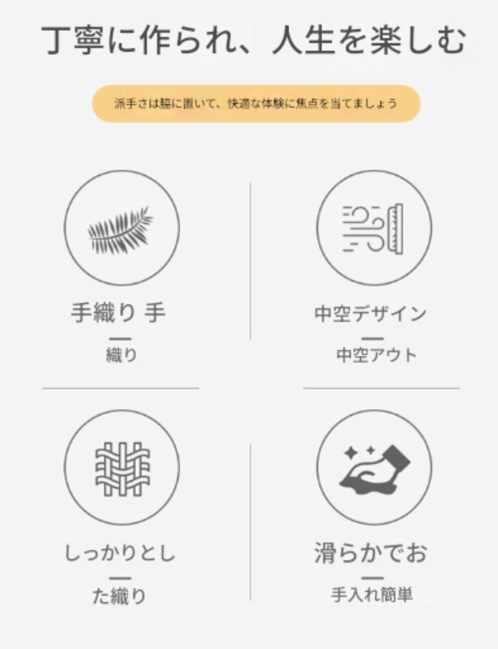 精巧な職人技:丁寧に編み込まれたラタンは、滑らかで自然なラインを生み出します。シンプルでスタイリッシュなデザインは、使用していない時でもエレガントな装飾品としてお使いいただけます