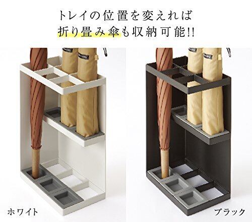 玄関の角にぴったりと収まるコンパクト角型かさたて 玄関で場所をとらない省スペースデザイン設計。トレイの位置を変えれば折り畳み傘を収納可能。傘収納可能数 6本