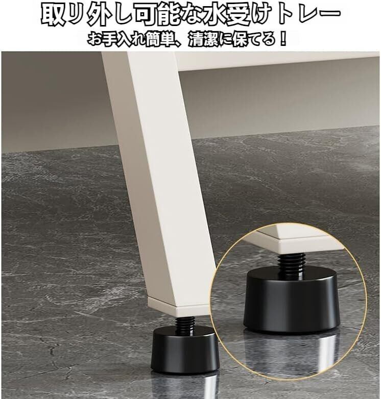 【高い耐久性と清潔感】: 1.2mm厚の鉄フレーム+ABS樹脂トレイのハイブリッド構造。耐荷重20kgと重厚感がありますが、撥水加工が施されているのでサビや臭いを防ぎ、水拭きも可能です。