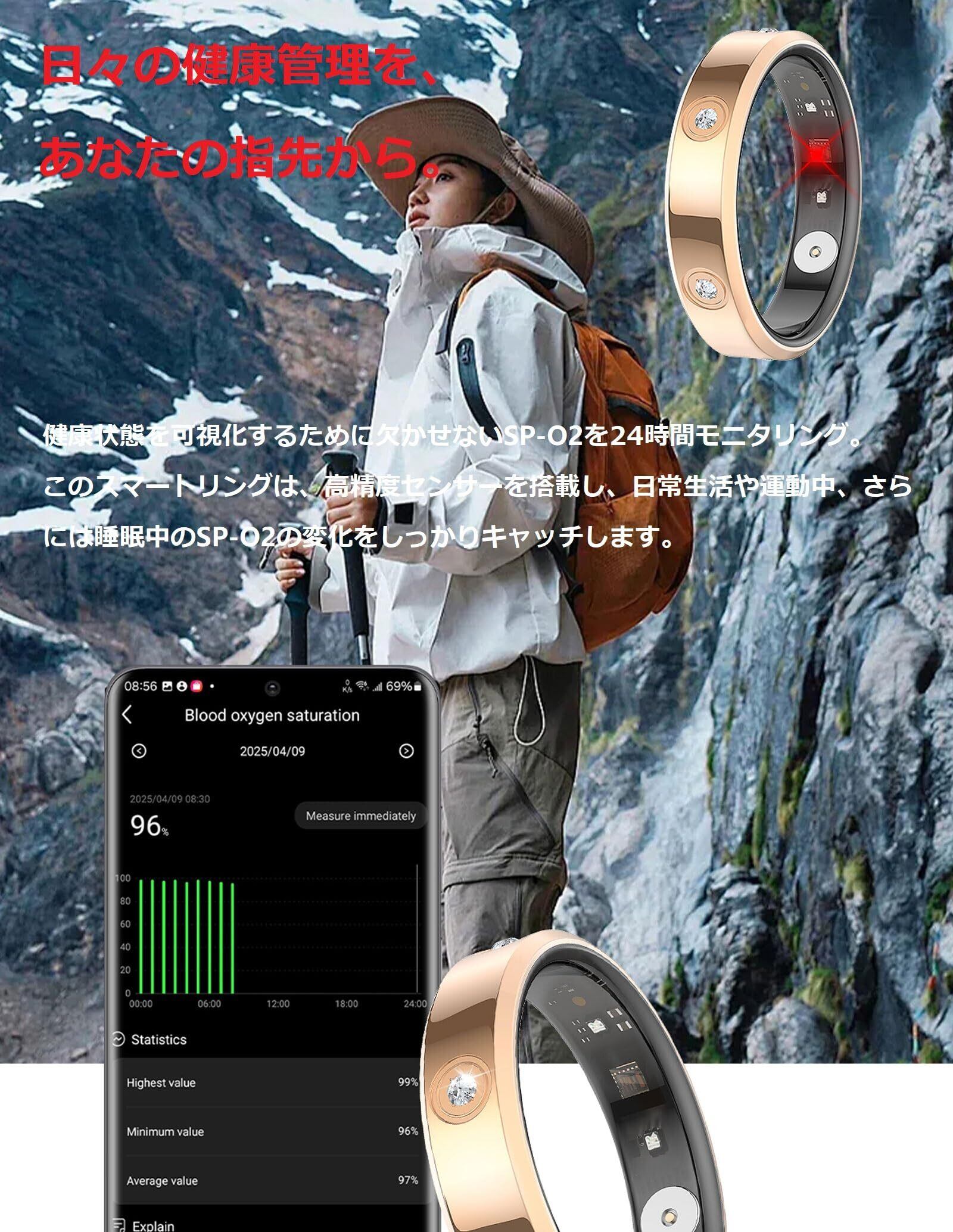 【あなたの健康を見守る。】睡眠記録から、H-Rの健康に関する通知まで。リングの先進的なセンサーが、自分の健康を一段と深く理解できるようにサポートします。毎日の健康状態の変化を見逃さないように、あなたをサポートする。体に取り込まれた【SP-O2の飽和度レベル】、【H-R】、【️睡眠時間】など、夜間の重要な健康指標をすばやく確認できます。