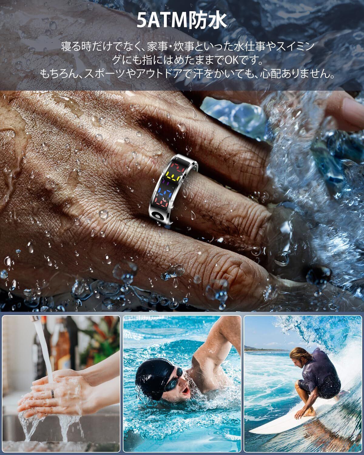 【長時間の使用&優れた防水性能】 最大20日間(スタンバイ状態)のバッテリー寿命を誇るスマートリングは、日常的な充電の煩わしさから解放されます。充電時は付属の磁石ケーブルで近づくと充電できて便利で、僅か2時間くらいでフル充電になります。さらに、5ATM等級の防水性能を備えており、雨や汗、さらには水仕事の際にも安心してご使用いただけます。毎日の生活に寄り添い、耐久性と便利さを提供します。