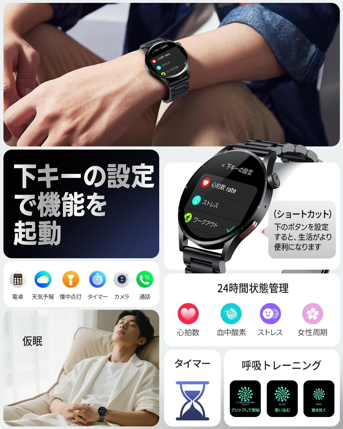 【Bluetooth通話&通知対応、超大容量バッテリー搭載】2025年最新のスマートウォッチ 丸型 メンズは、腕を上げるだけでLINEやTwitterなどのメッセージ確認やハンズフリー通話が可能。約30分の急速充電で1日分の使用ができ、フル充電(約2時間)で8〜10日間の連続使用、2〜3日間の常時表示、最大21日間の待機時間を実現。ワークアウトやBluetooth通話も安心して楽しめる圧倒的スタミナが魅力です。