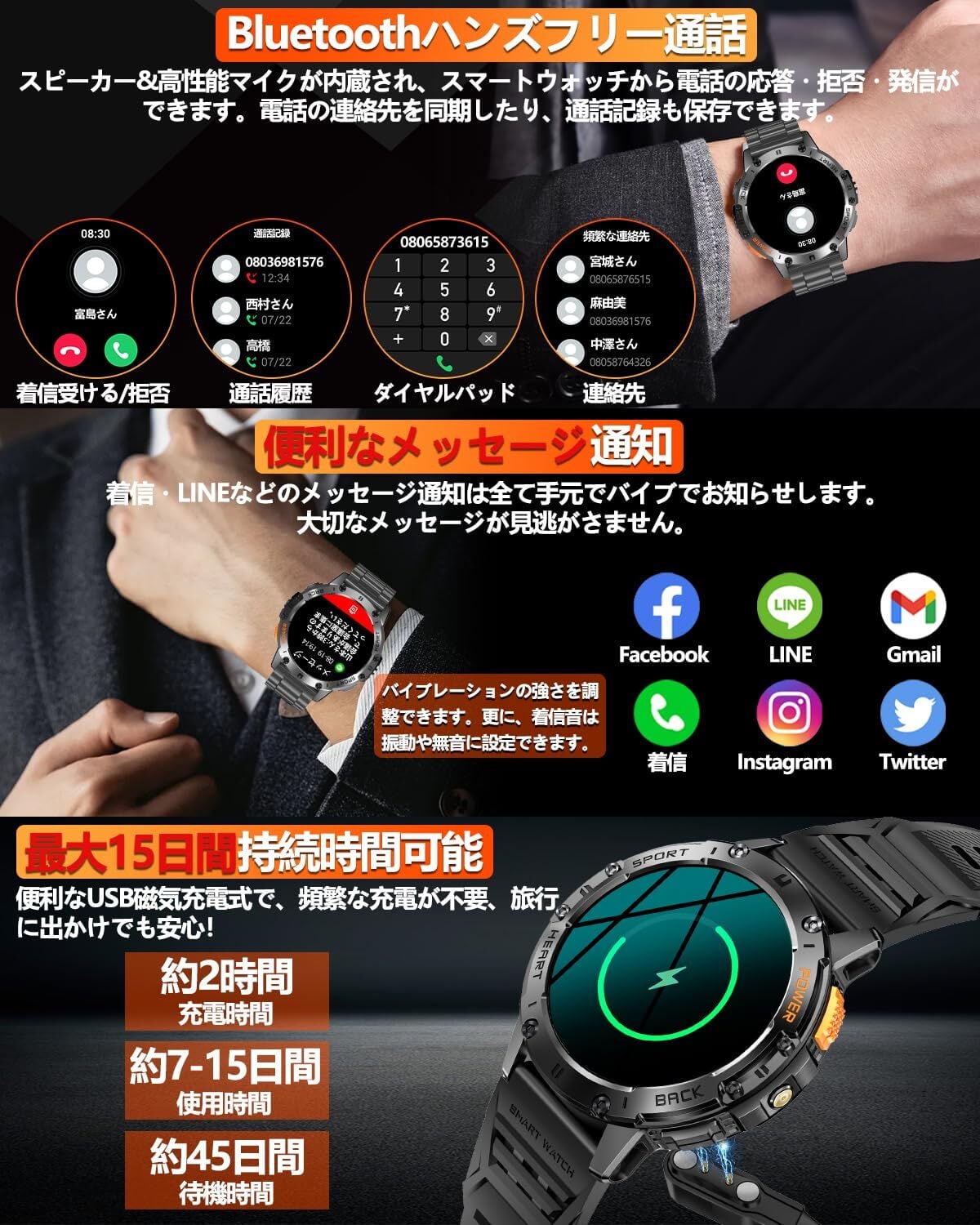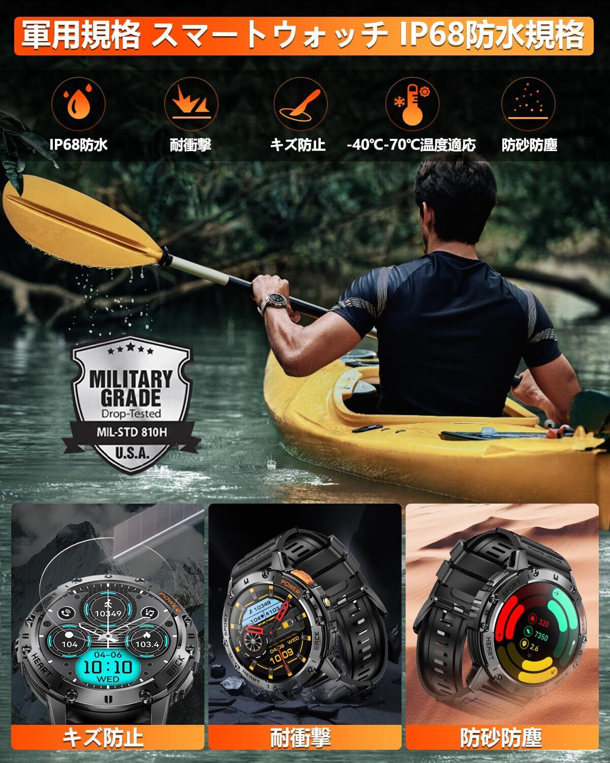特徴 腕の懐中電灯、軍用規格、Bluetooth5.3通話、耐衝撃、キズ防止スクリーン、IP68防水、 530mAh長持ちバッテリー、着信音設定、ビジネスとアウトドア向けの2種バンド付き
