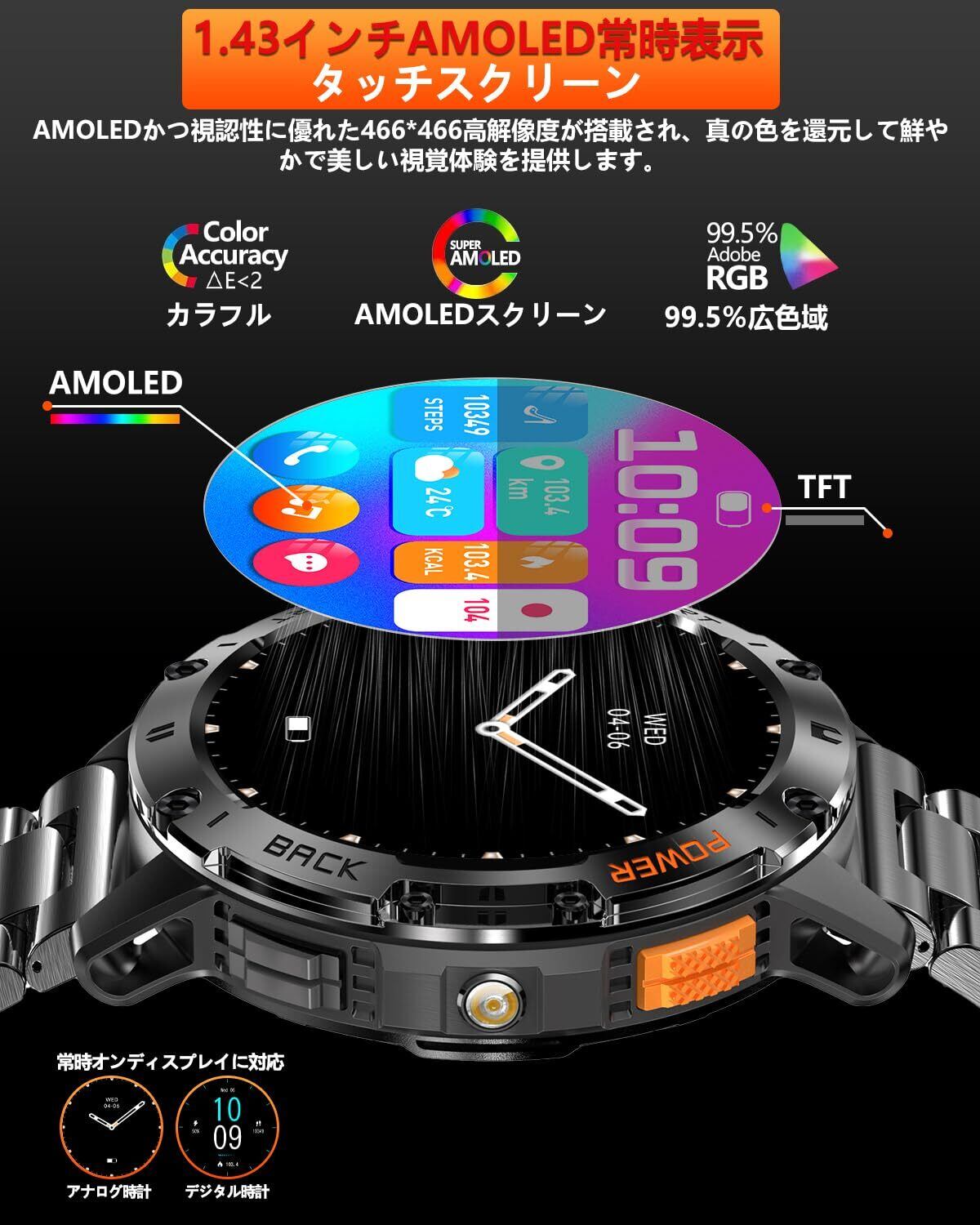 【卓越な品質と洗練されたデザイン1.43インチAMOLEDスマートウォッチ&常時表示&軍用規格】AMOLEDスマートウォッチ K65は1.43インチAMOLEDタッチディスプレイを搭載したスマートウォッチで、視認性に優れた466*466高解像度大画面を採用され、画質がより鮮明になり、より高精度な大画面で文字を表示されます。例のない快適な視覚感と優れた操作感をもたらします。強い日差しの下でも情報が鮮明に表示されます。常時表示機能(アナログとデジタル)が付け、目線を時計に移すだけでパッと時間を確認できます。従来のタイプと比べると、手首を返さずに時間を確認し、文字盤がファションとして活用できます。このスマートウォッチは特殊な複合材料を採用され、耐低温、耐高温、耐衝撃、防水防塵など、多くの軍用標準テストに合格することができます。スポーツウォッチは、間違いなく野外活動のようなときにあなたの信頼できる仲間になることができます。日常から過酷な自然環境まで、あらゆるシーンで適用されます。Smart watchの画面は耐衝撃性のHDパンダガラスが採用するため、耐久性と傷がつきにくくなっています。