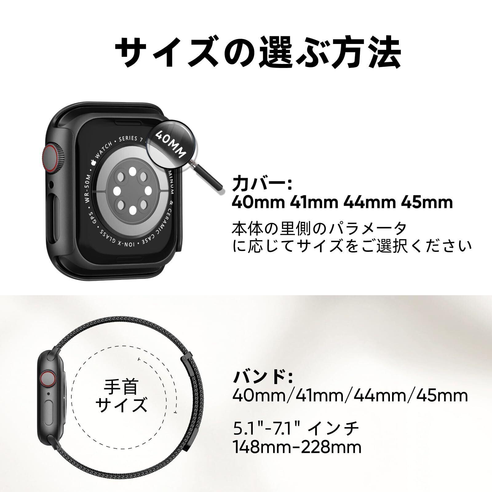 【対応機種】アップルウォッチ ケース付きバンド、Series 9 8 7 6 5 4 3 2 1 SEの40mm 41mm 44mm 45mm 機種だけに対応します、手首サイズは148-228mmの方に適します、に適しています男女兼用のビジネススタイル Apple Watch バンド 、iWatch本体の里側のパラメータに応じてサイズをご選択ください。
