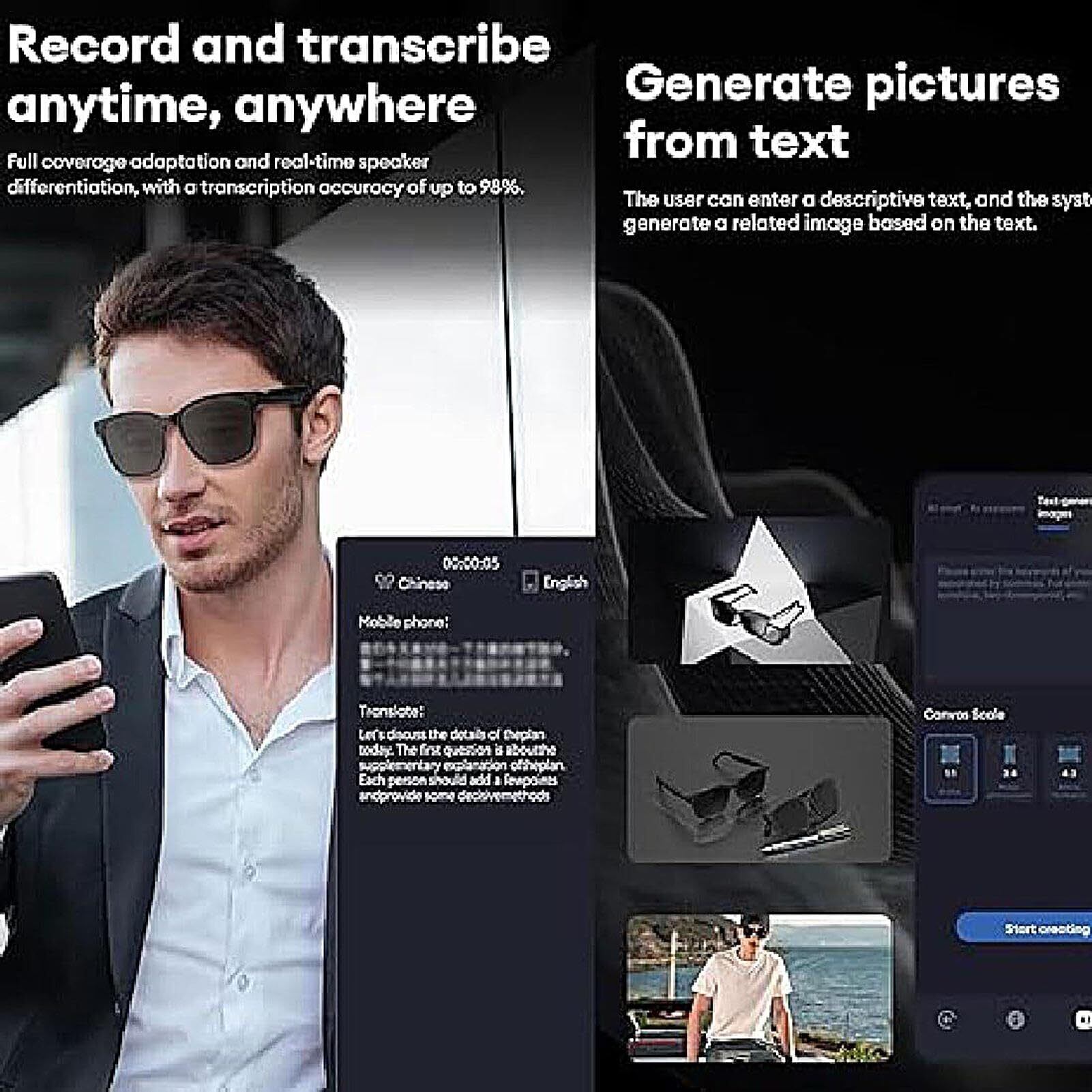 つながるパートナー:信頼性のある音楽再生と革新的なAI翻訳、ワイヤレス通話機能を備えた多用途なスマートグラスデザインをお楽しみください。音楽やコミュニケーションをサポートするこのスマートデバイスは、移動中でも快適に使用可能です。スマートグラスで未来志向の生活を始めましょう。