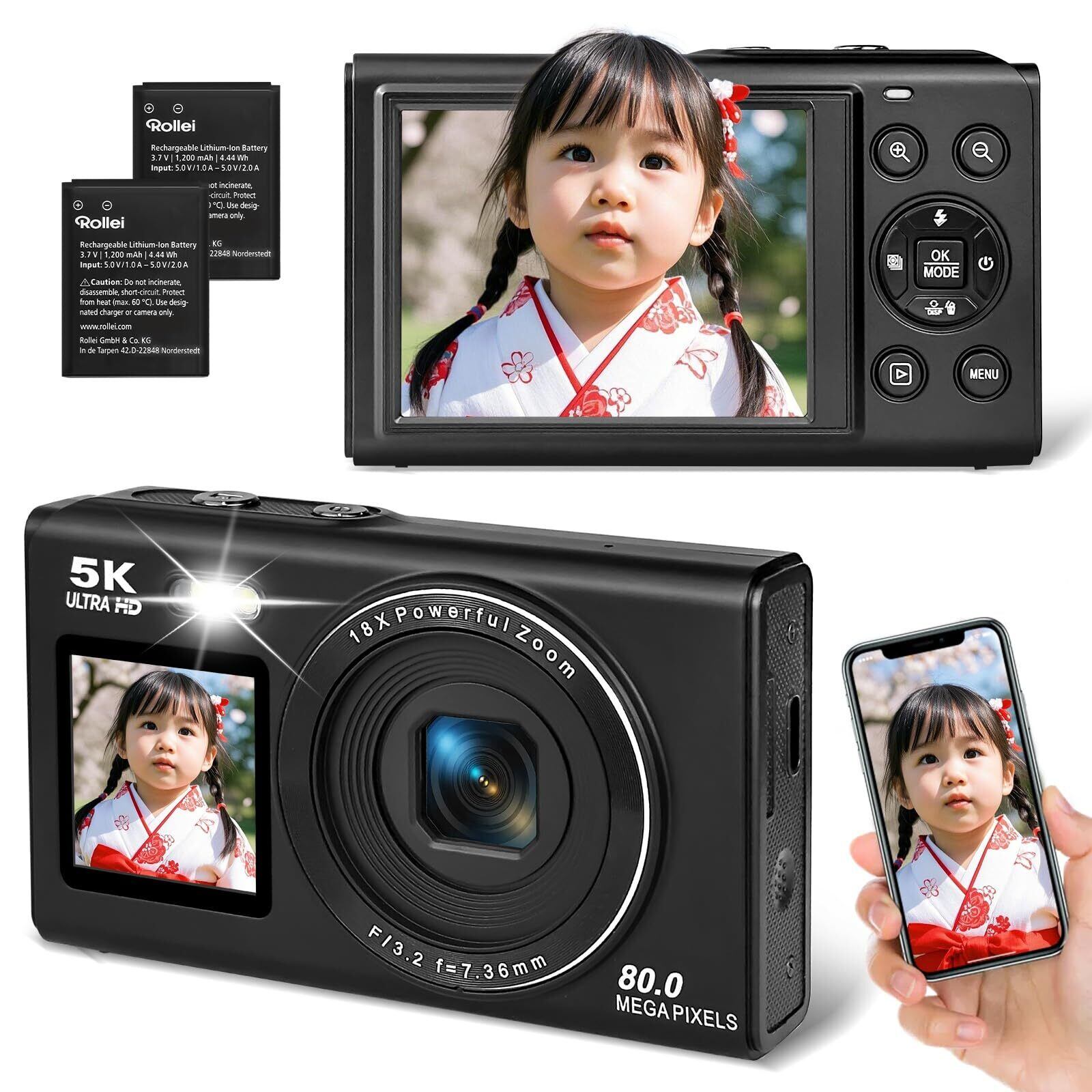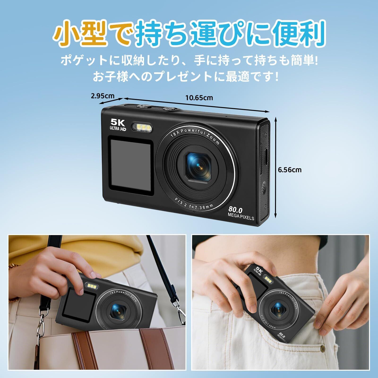 デジカメ5K80MPWIFI機能小型デジタルカメラポケットカメラ8000万高画素充電式AFオートフォーカス機能18倍デジタルズーム2.8/1.54インチデュアルディスプレイクリスマス誕生日軽量携帯便利青少年大人初心者向け日本語説明書予備バッテリー