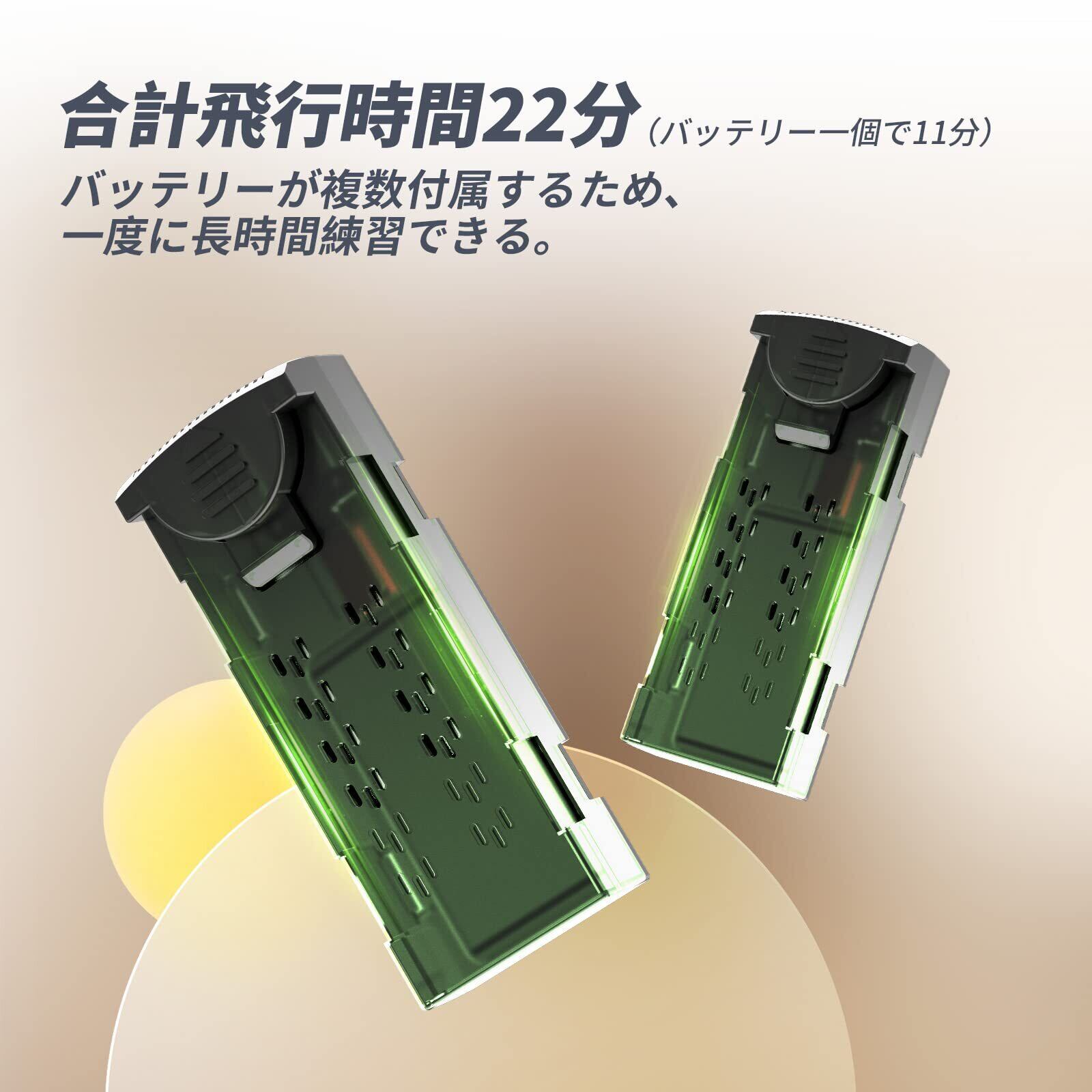 【バッテリー2個】D70ドローンは、充電式リチウムイオン電池を採用します。2つの電池が付いており、合わせて22分になります。運転時間が長くなり、ドローン操縦にもっとハマれます。2つの電池を順に充電し、交換して使うと、使用寿命がより長くなります。