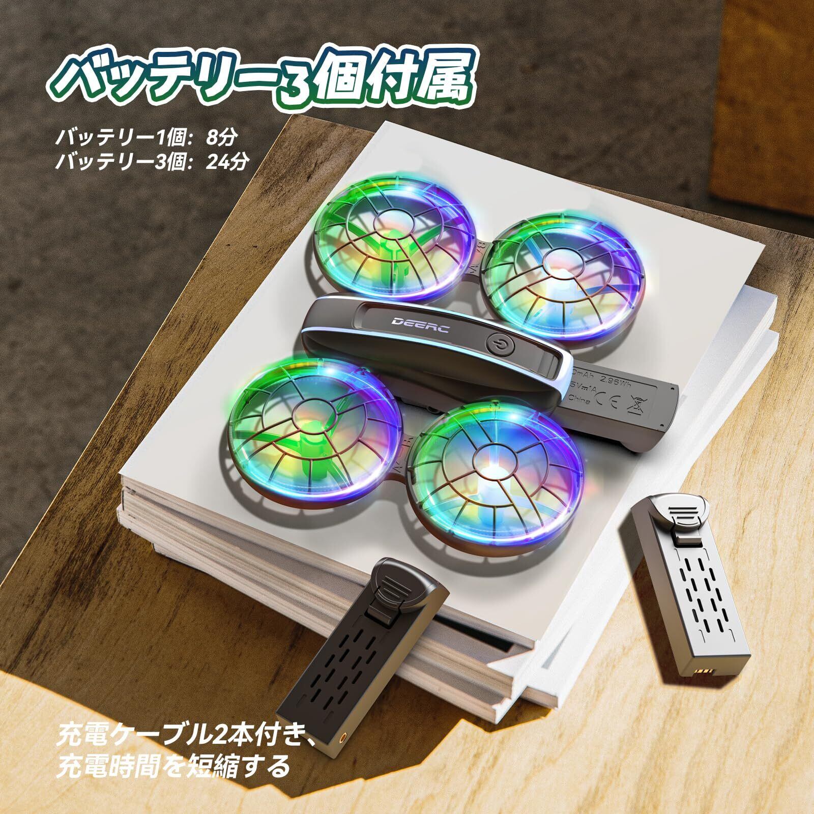 ✈【バッテリー3個&充電ケーブル2本】簡単に交換可能なモジュール化バッテリーを3個付属し、総飛行時間は24分となり、小型ドローンの中でもトップクラスの耐久性を誇ります。また、2本の充電ケーブルで同時に充電すれば、充電時間も短くします。