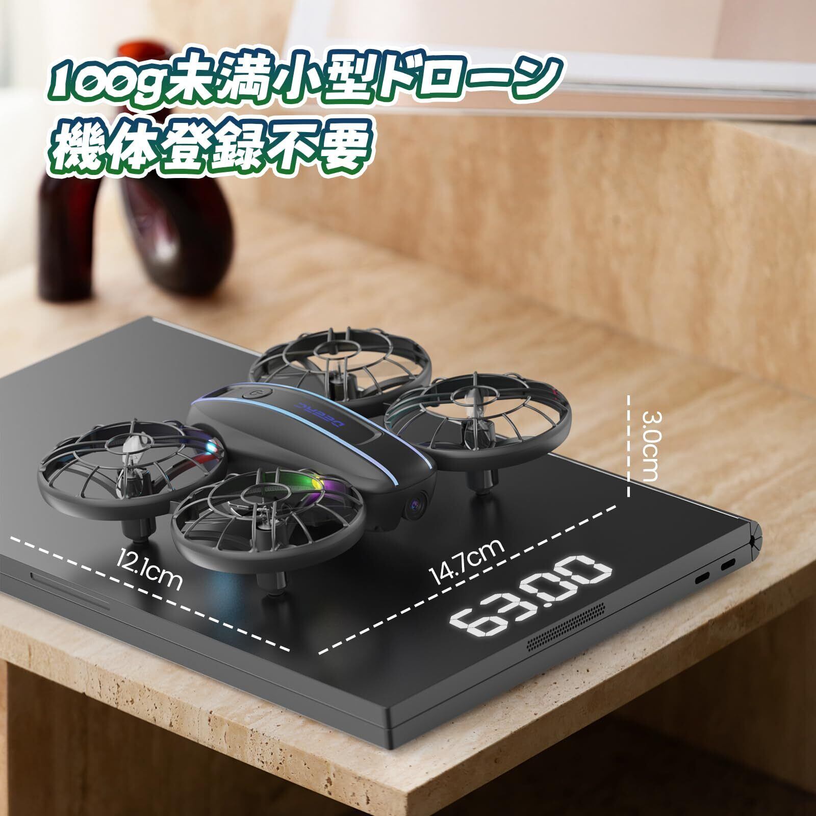 ✈【100g未満&申請不要】バッテリーを装着すると、重さがわずか63g、ドローン登録義務化の対象外製品です。届いたらすぐに遊べるので、お子様へのギフトに最適です。また、14.7*12.1*3.8㎝の小型サイズで、練習場所を取らず、狭い廊下でも飛行を楽しむことができます。