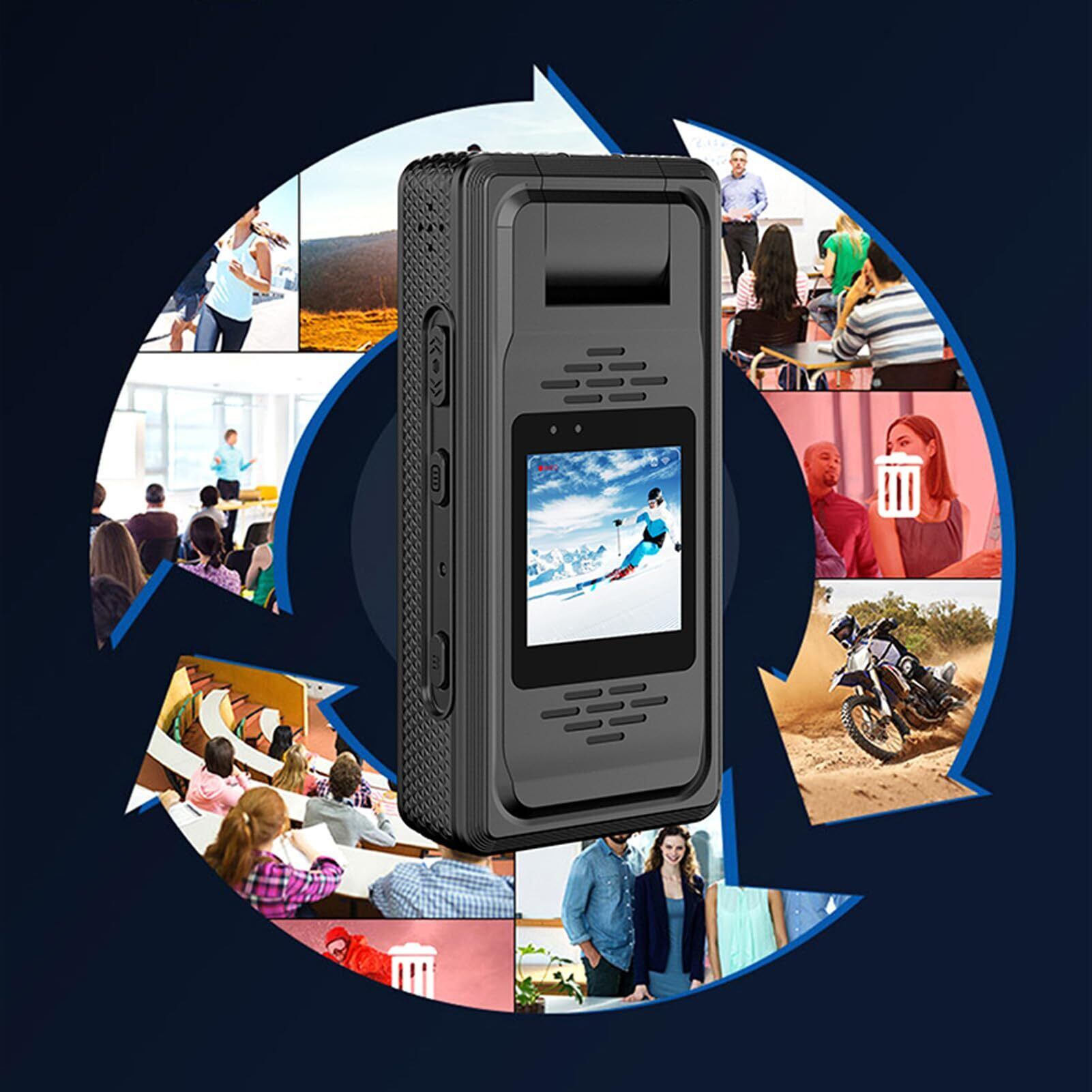 180度の回転レンズ:ボディカムは180度回転レンズを備えているため、複数の角度からビデオを録画し、撮影中に正しい方向に自動的に切り替え、モーメントをキャプチャする柔軟性と創造性が向上します。