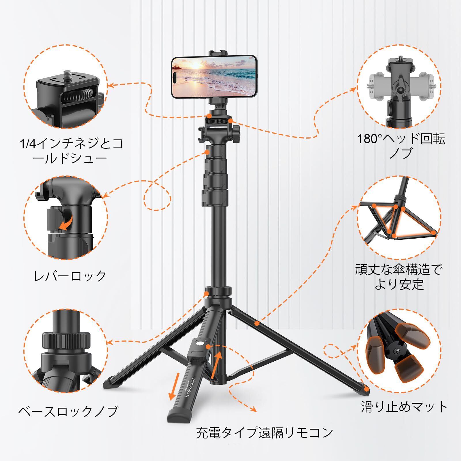 高品質な素材&抜群な安定性: 高品質のアルミ合金材料で作られ、脚に滑り止めゴム素材を採用します。三脚のデザインにより、安定性、滑り止め性、耐衝撃性に優れ、より美しい写真を撮ることができます。軽量ながらも丈夫な素材を使用し、しっかりとしたグリップ感を実現しました。滑りにくく、安定感のあるホールド感があり、握りやすいデザインです。