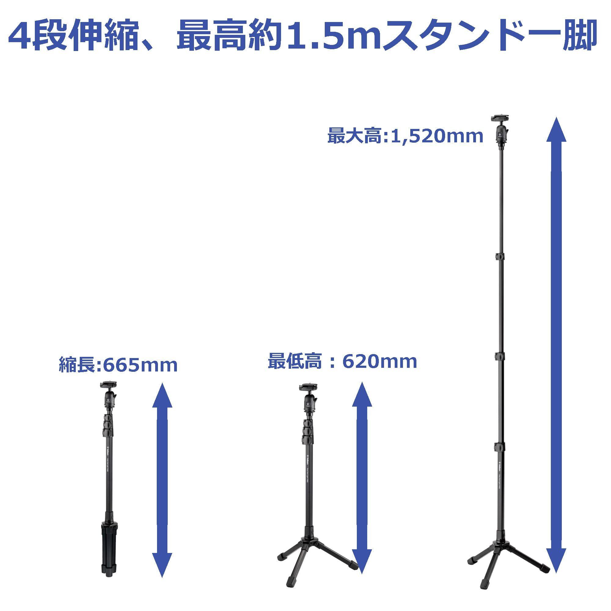 ■全高:1520mm、■最低高:620mm、■縮長:665mm、■脚径/段数:ポール20mm4段/脚部17mm1段■質量:485g、■推奨積載質量:1.0kg、■雲台分離:不可
